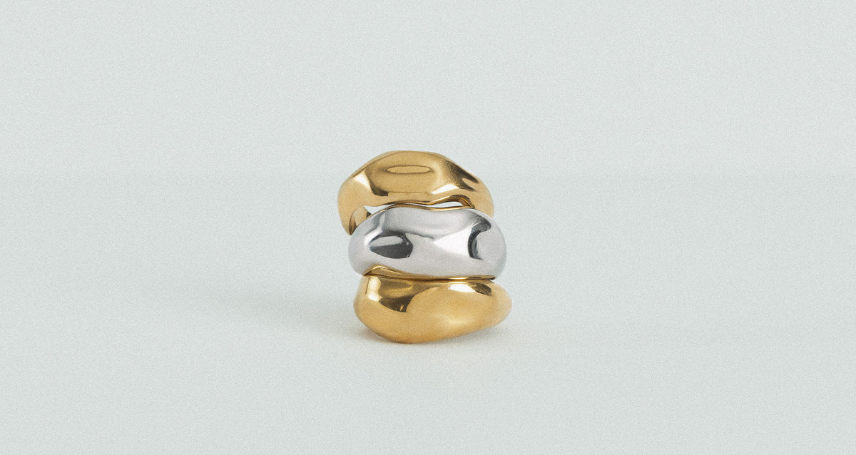 A collection of statement rings, characterized by bold silhouettes and unique details. Made from high-quality stainless steel and available in the colors silver and gold.