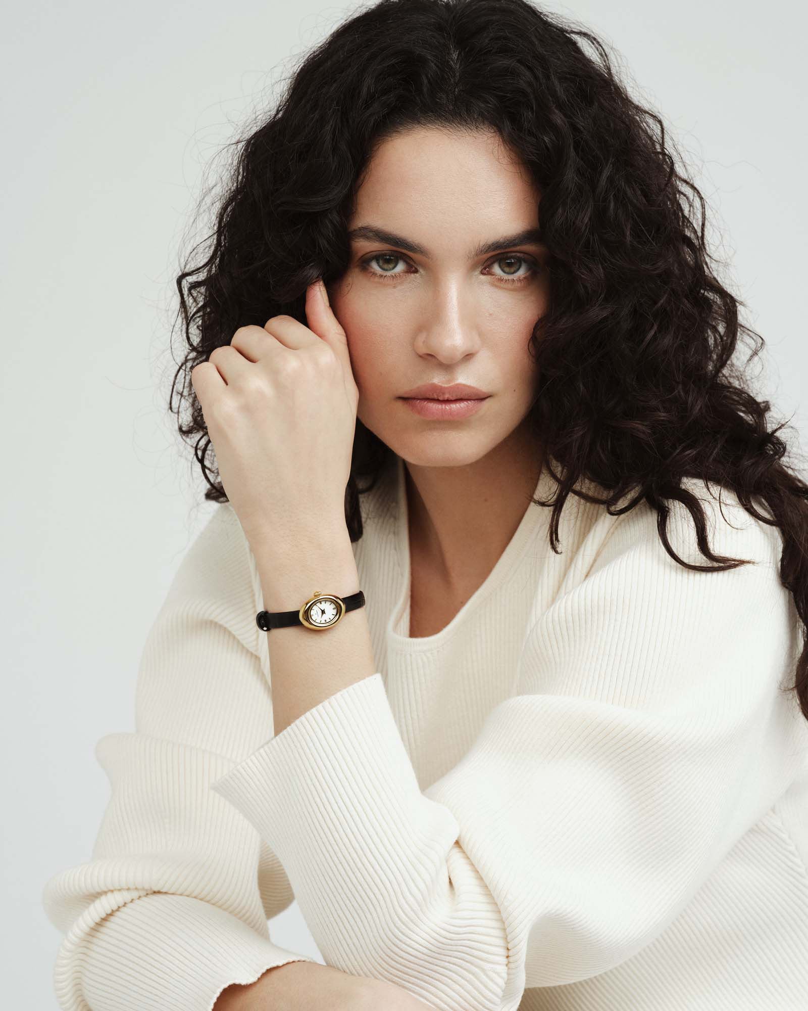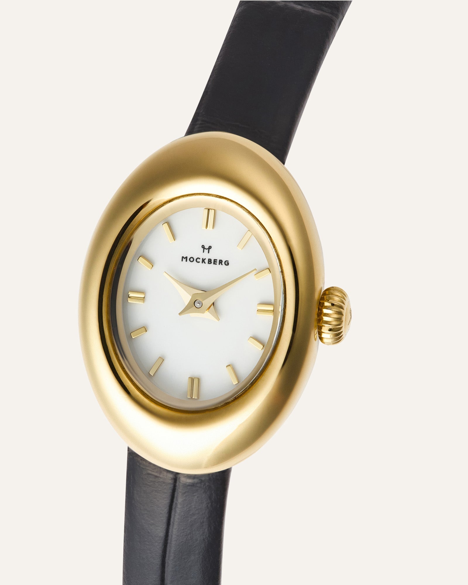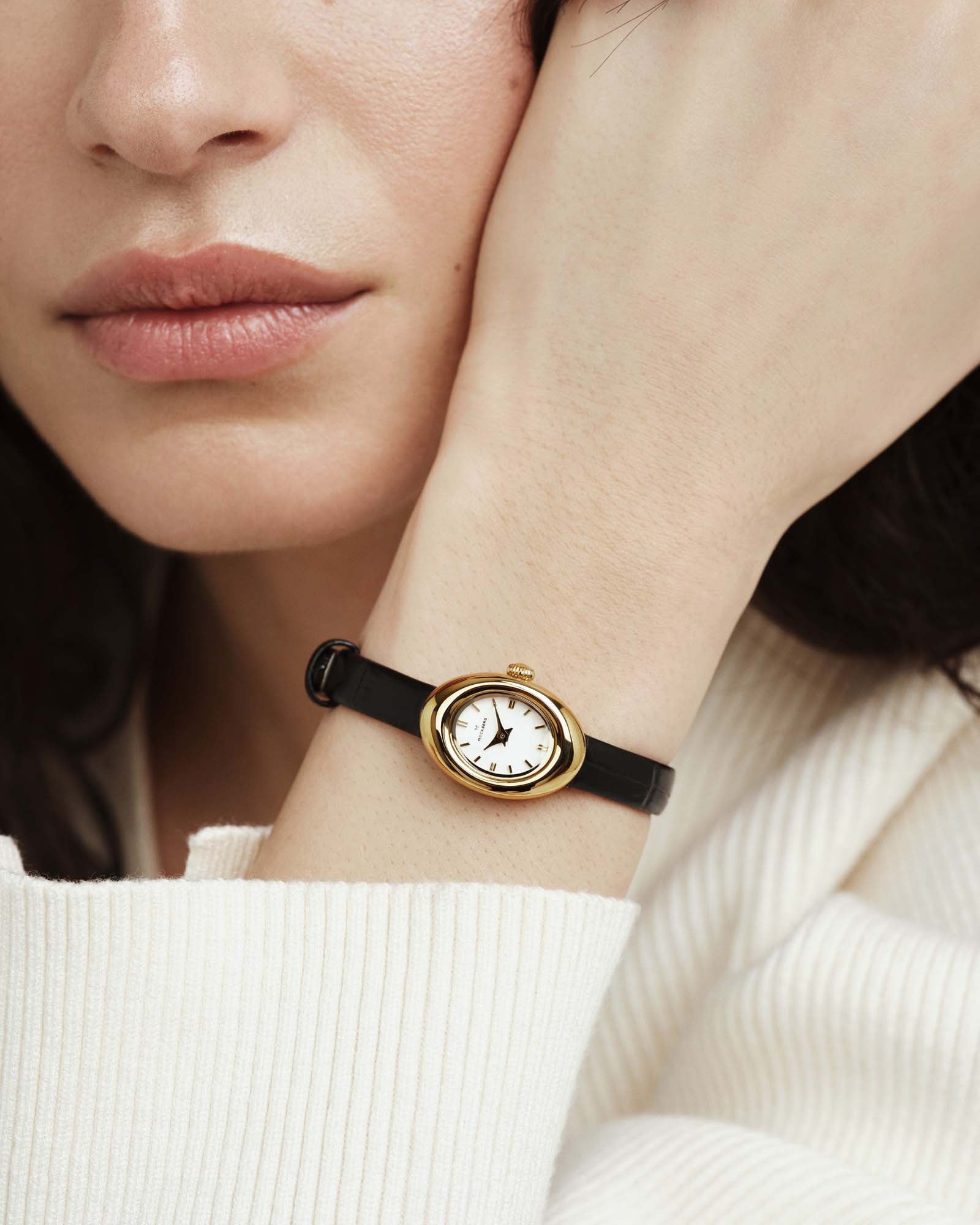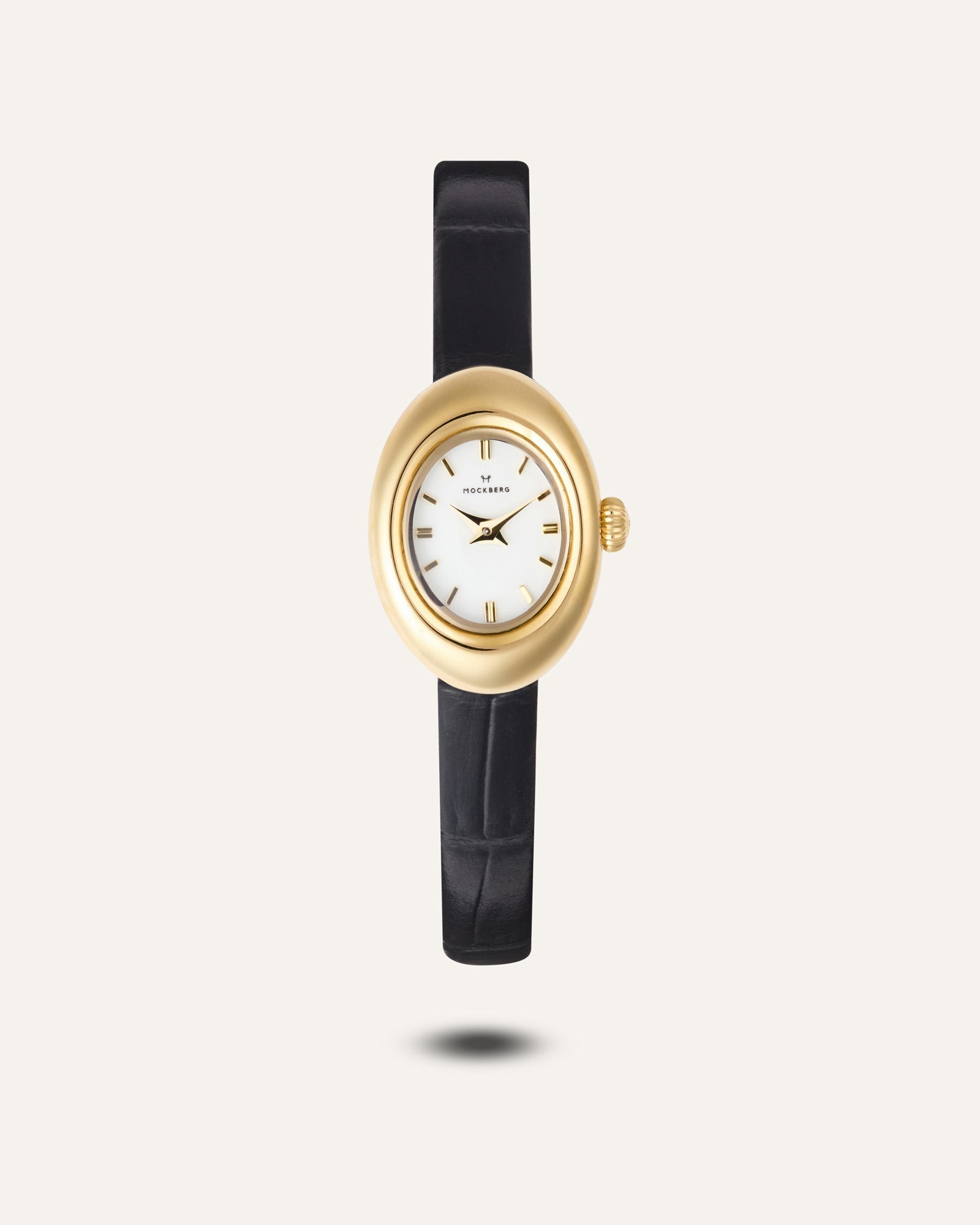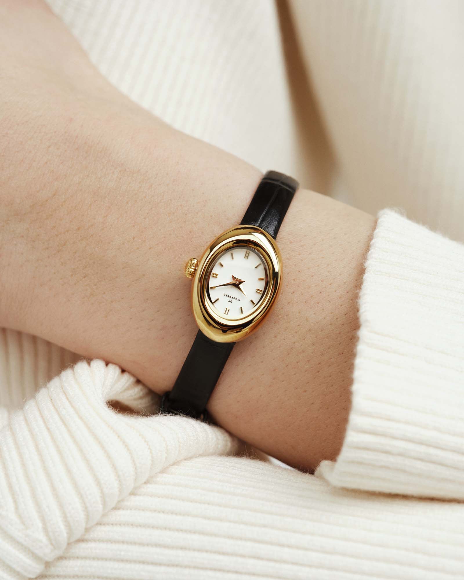The Belle Oval Leather in a smaller design. This watch features a classic black leather strap and a softly rounded oval case, paired with timeless leather for an elegant look.