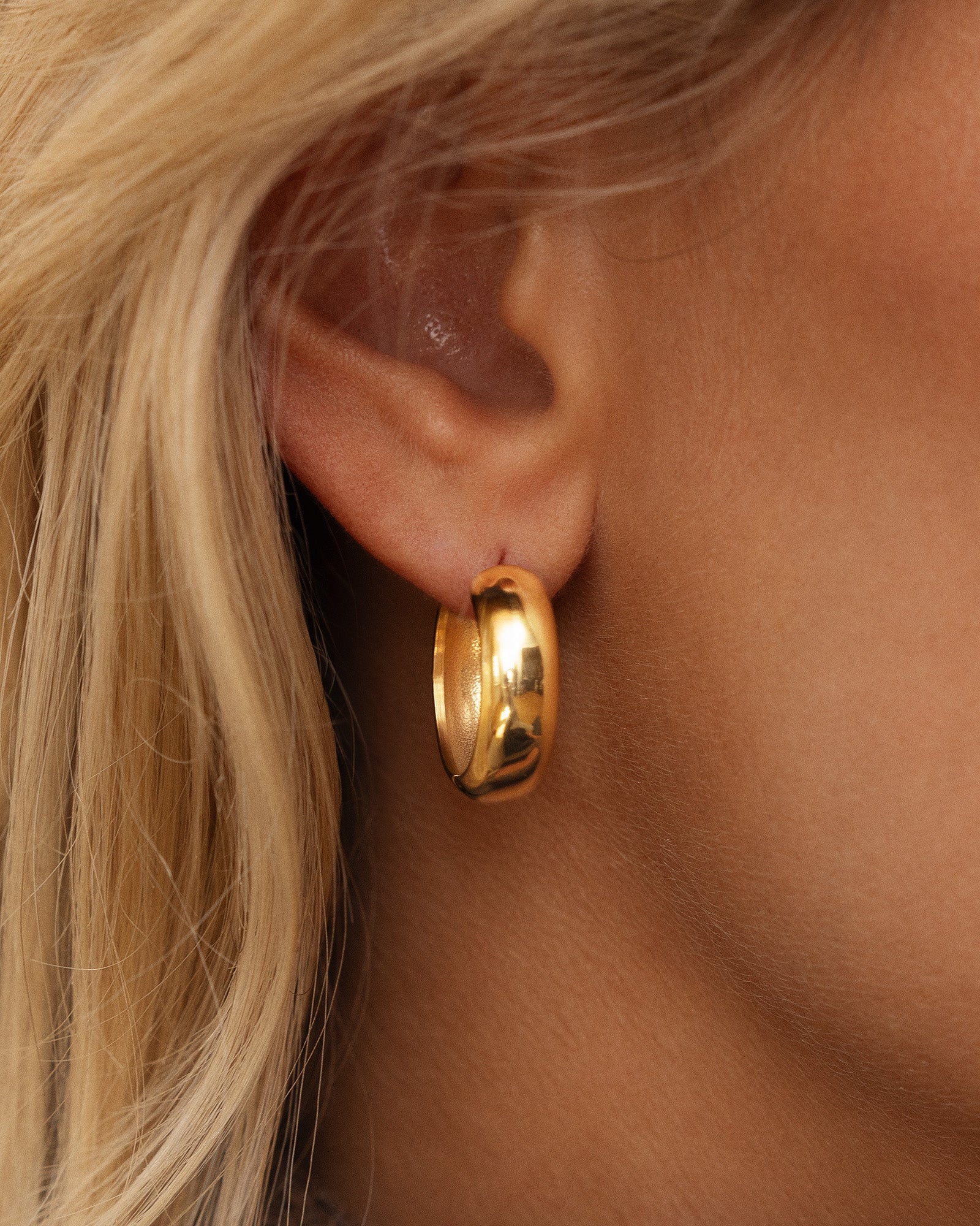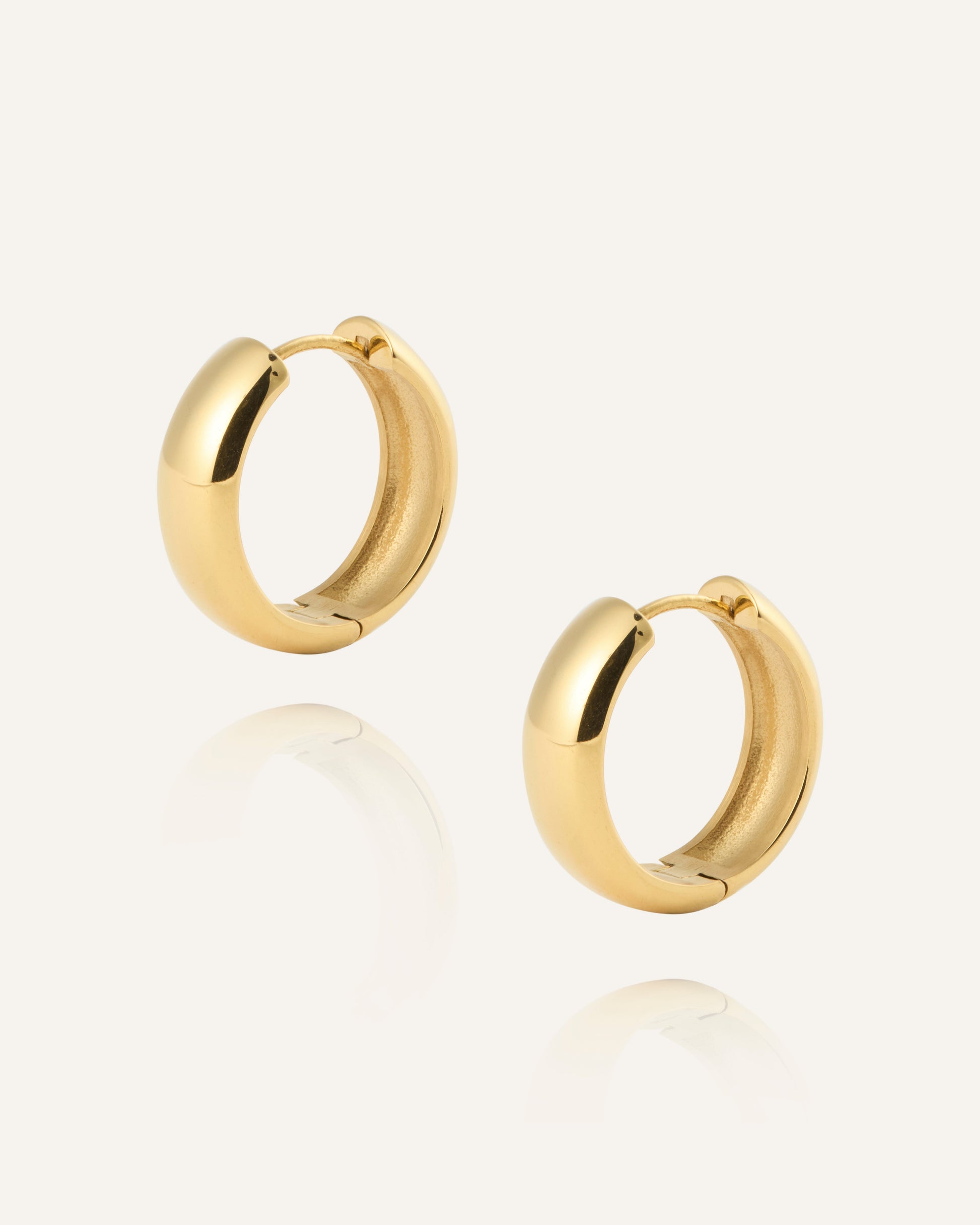 Brave Medium Hoops in a gold-tone finish feature a softly domed, compact design that sits close to the ear. Made from stainless steel plated with 18K gold using PVD technology, they retain their shine with daily wear. The polished surface creates a defined yet balanced look that works from day to night. Wear them solo for a clean look or pair with smaller studs for a personal touch.