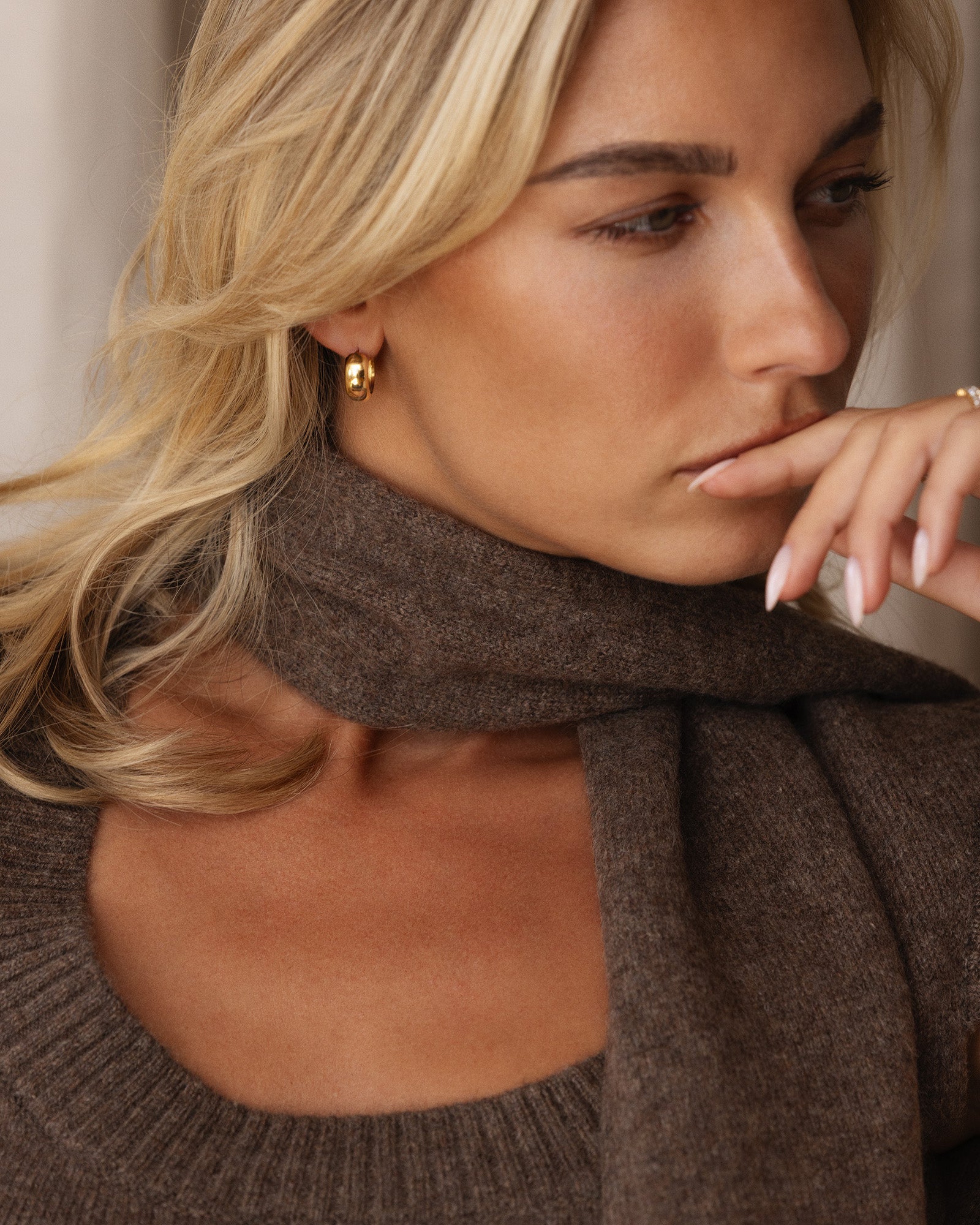 Brave Small Hoops in a gold-tone finish feature a softly domed, compact design that sits close to the ear. Made from stainless steel plated with 18K gold using PVD technology, they retain their shine with daily wear. The polished surface creates a defined yet balanced look that works from day to night. Wear them solo for a clean look or pair with smaller studs for a personal touch.