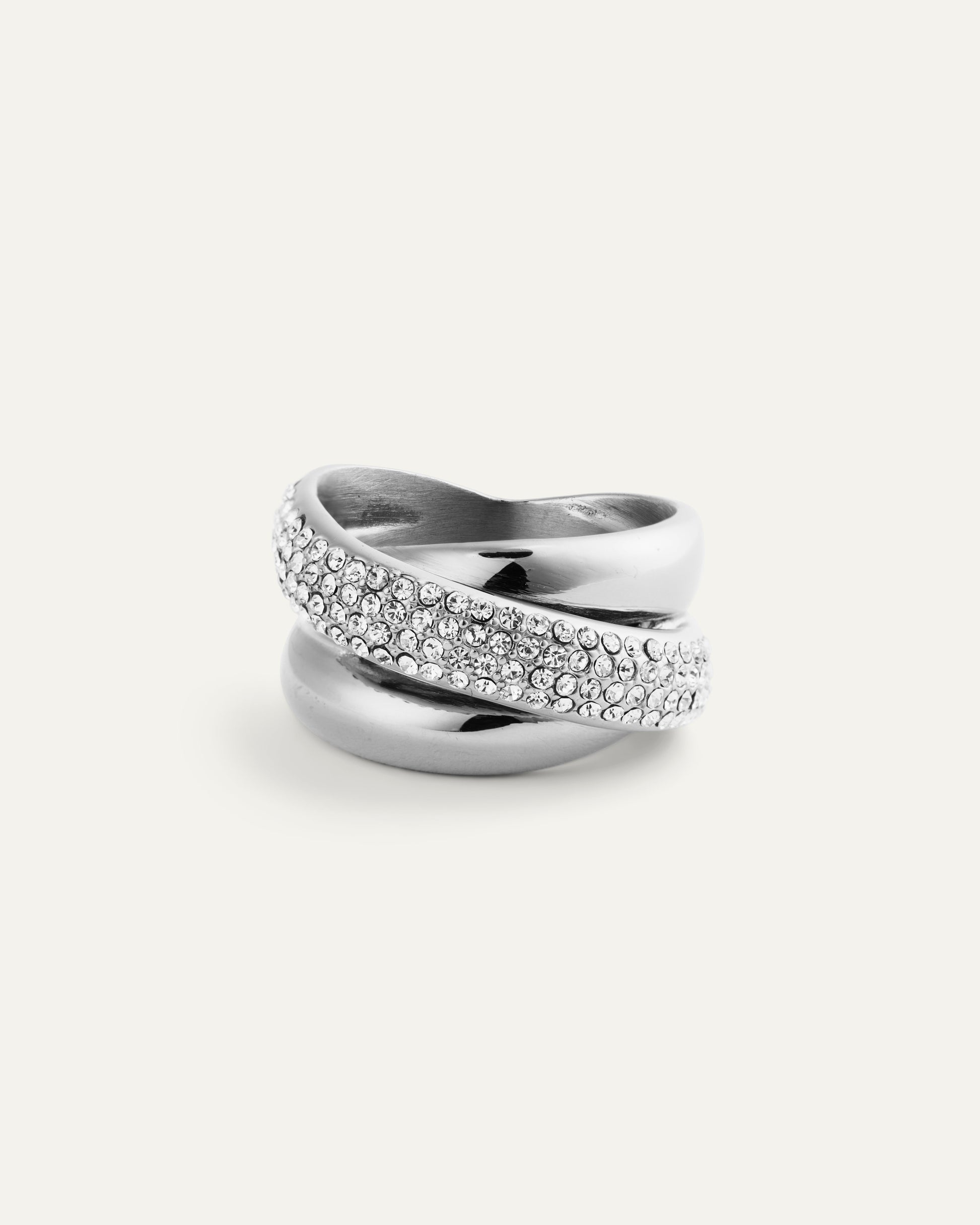 Two worlds in balance: softly sculpted metal meets pavé-set white Preciosa stones in a twisted profile. The silver finish offers a cool, refined look that works perfectly from day to night. Wear it solo or stacked for extra radiance.