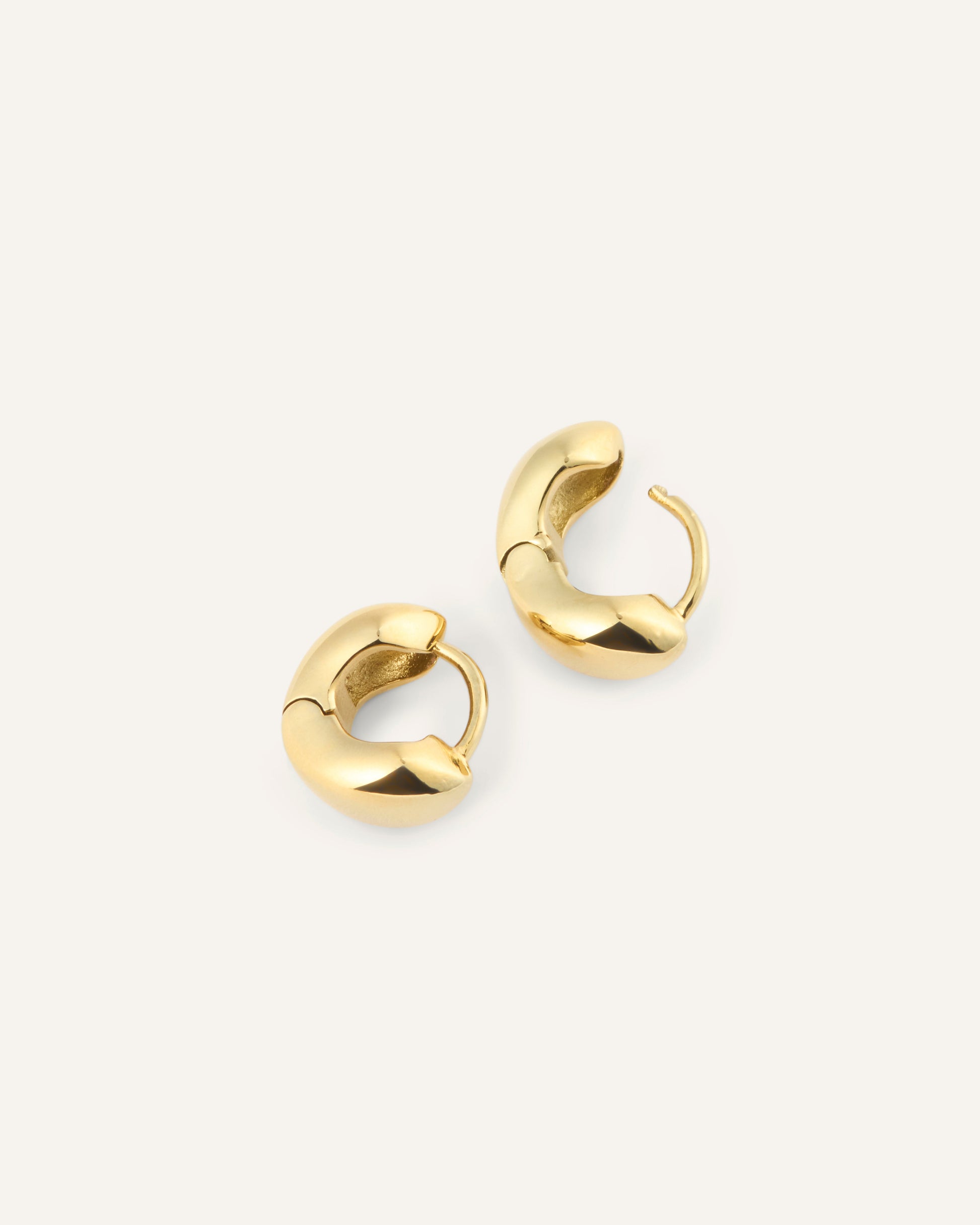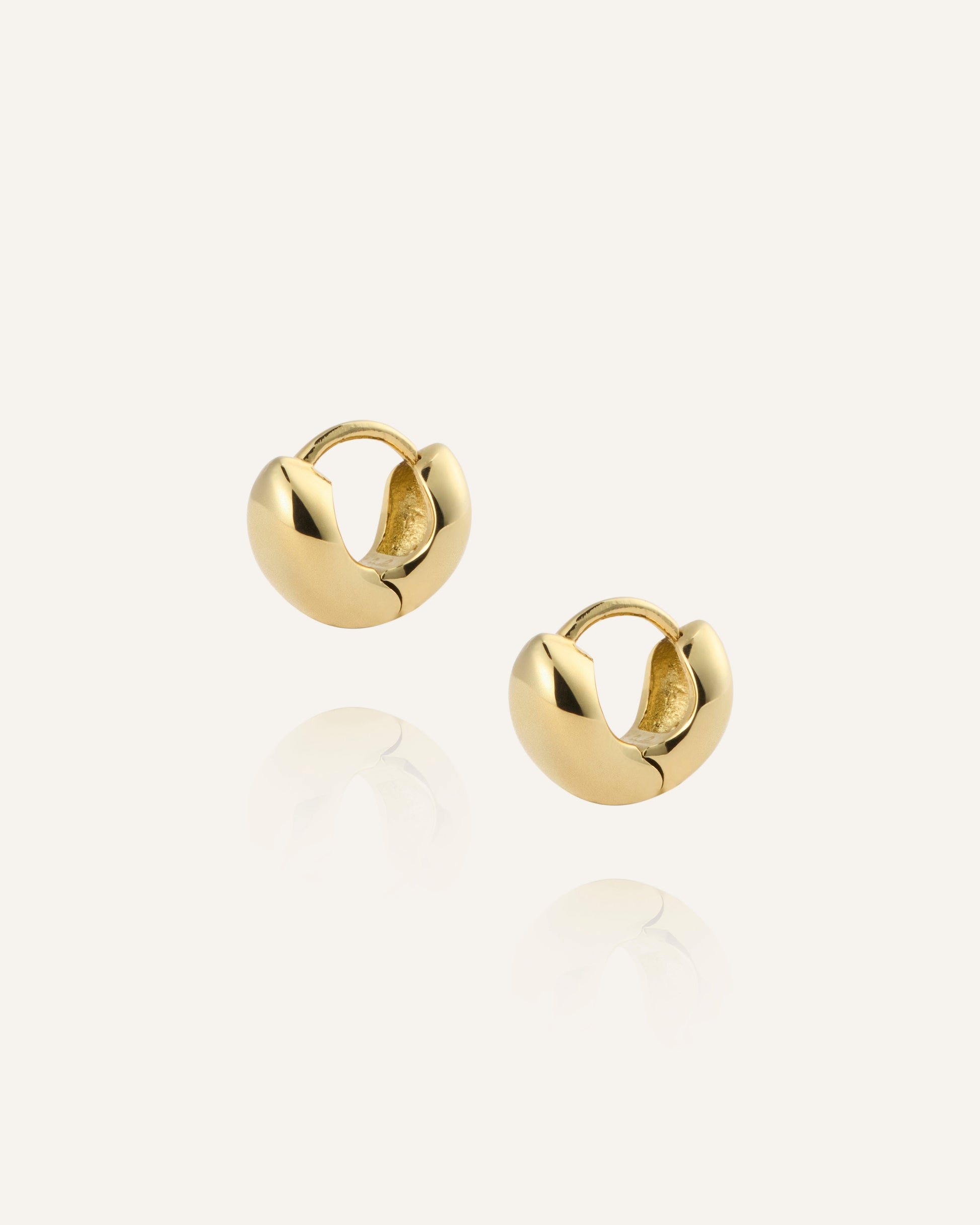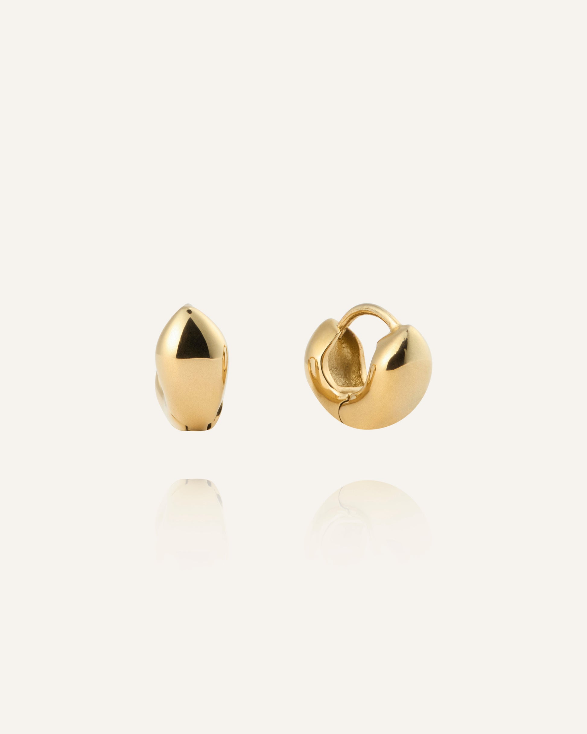 Bulky Huggies in a gold tone feature softly rounded, sculptural forms that catch the light beautifully. The compact design creates a clear yet balanced look that elevates both everyday and evening outfits. Wear them solo for a clean style or pair with studs for a personal touch.