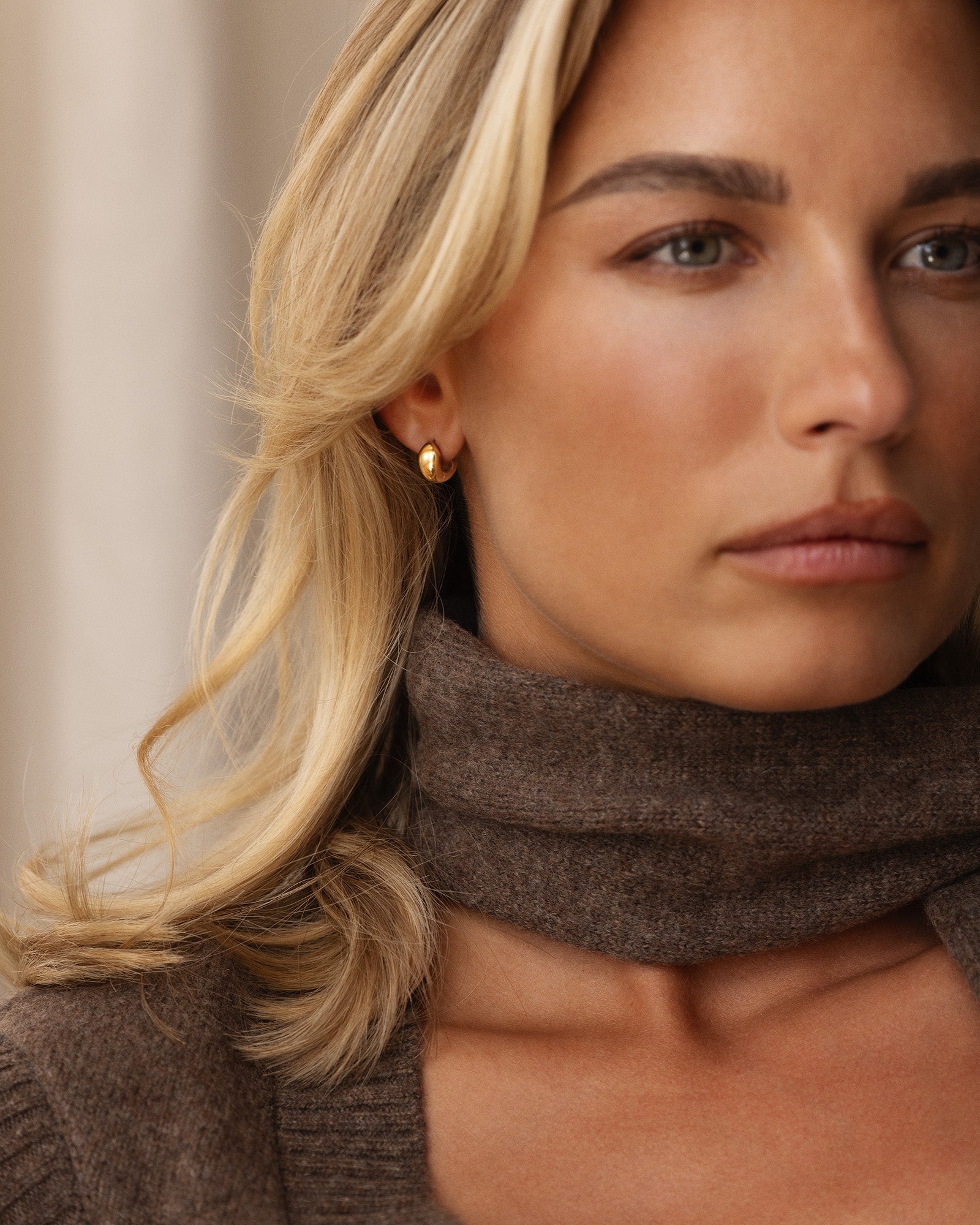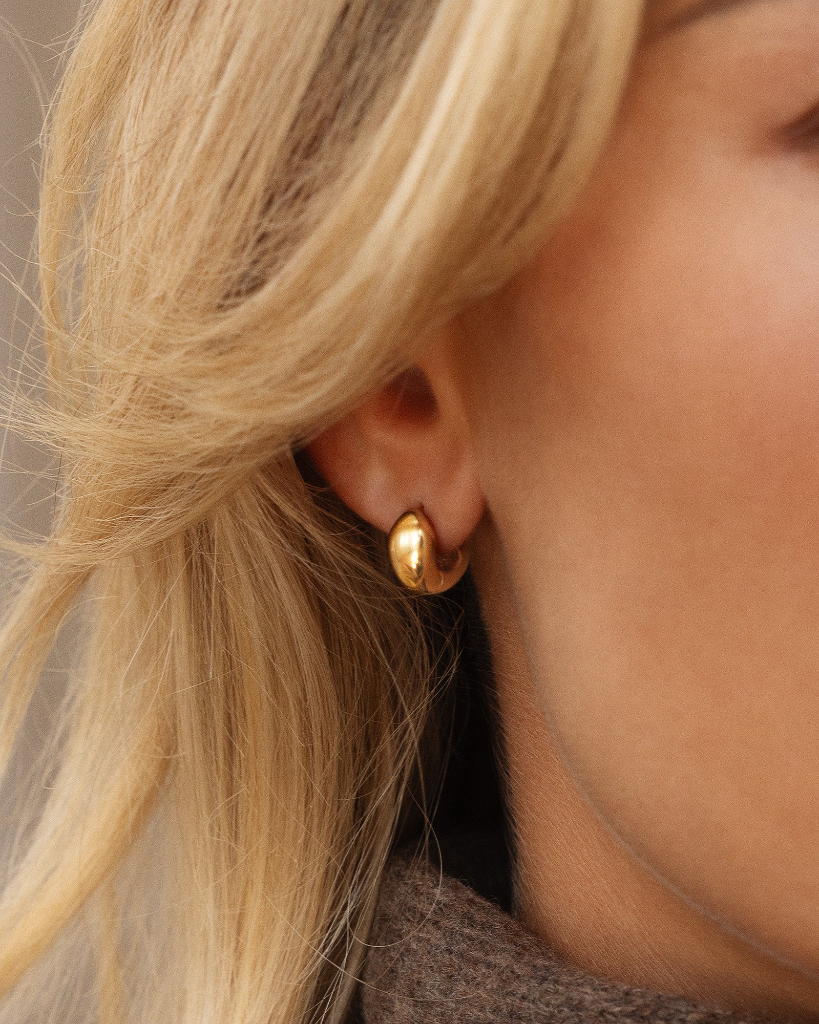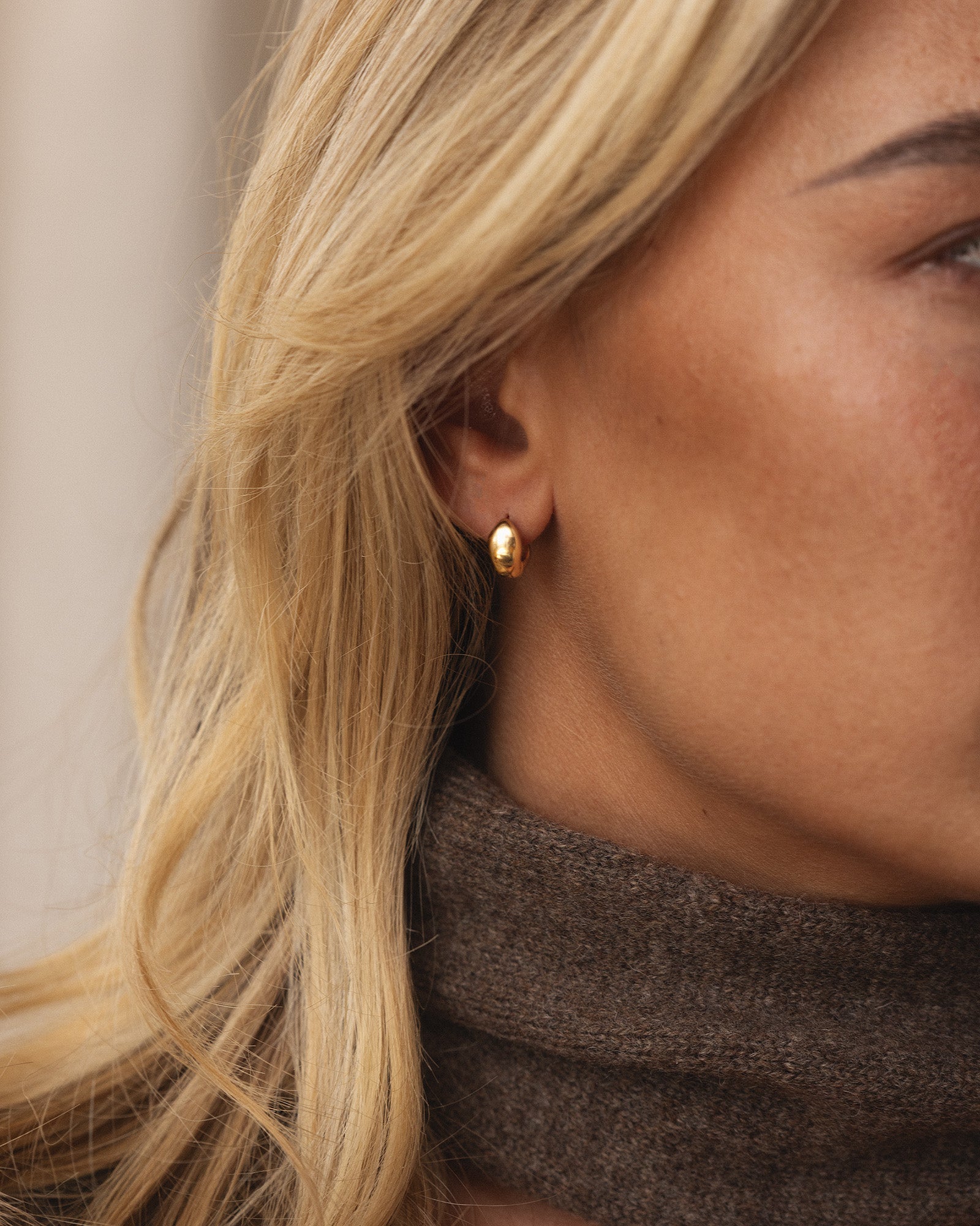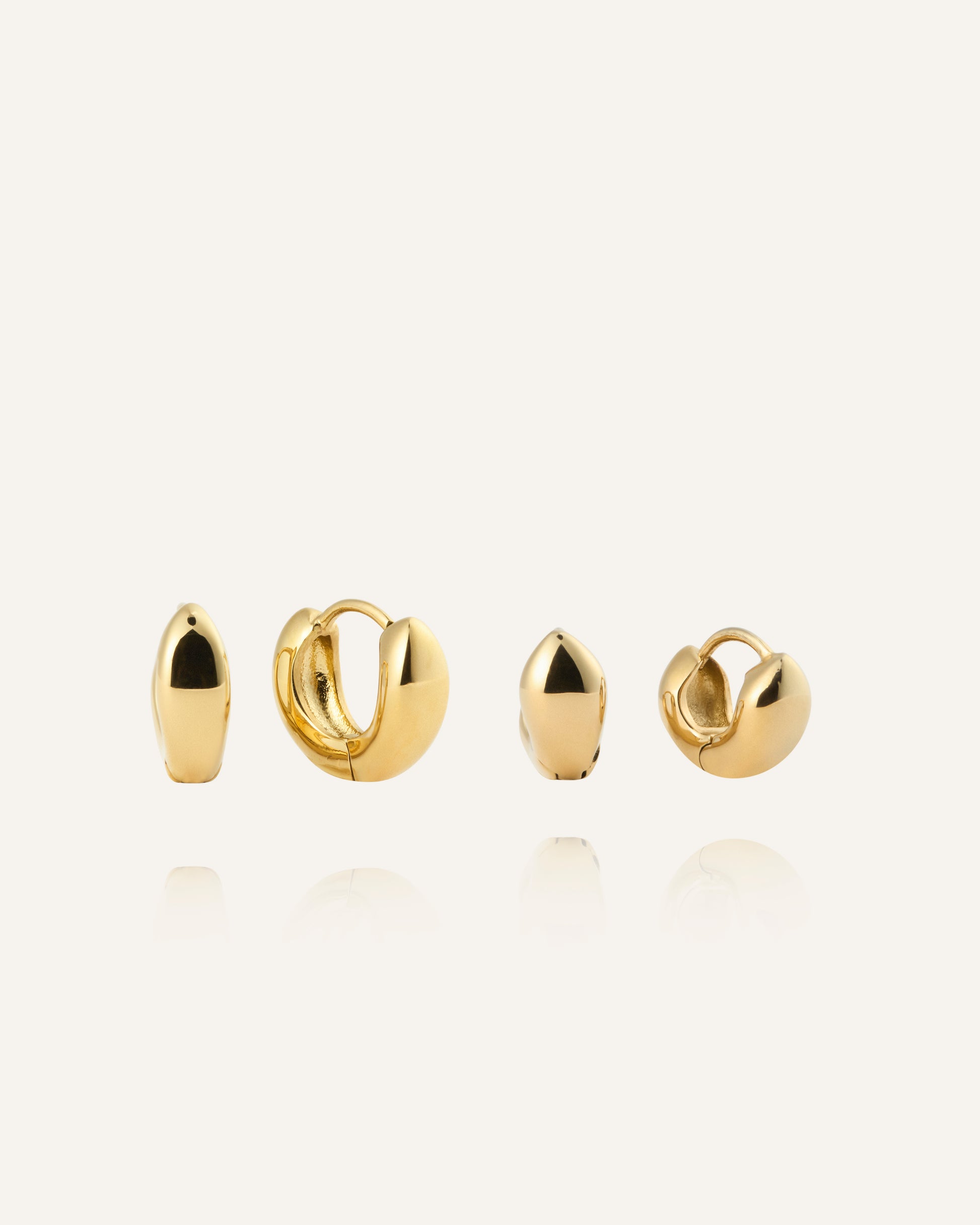 Bulky Huggies in a gold tone feature softly rounded, sculptural forms that catch the light beautifully. The compact design creates a clear yet balanced look that elevates both everyday and evening outfits. Wear them solo for a clean style or pair with studs for a personal touch.