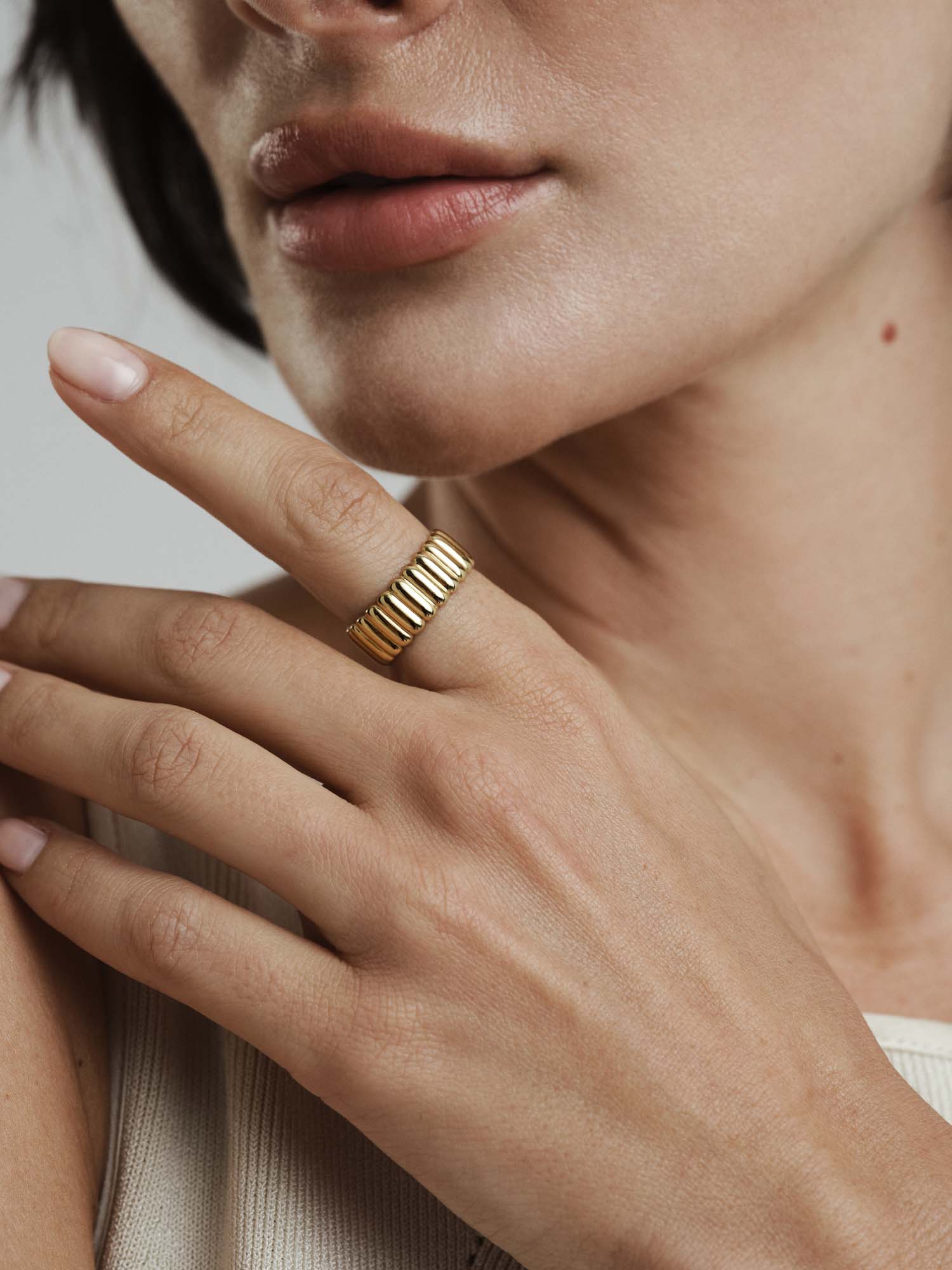 Chic Ribbed Ring has a wide, ribbed design. Made from solid stainless steel with durable 18K gold PVD plating, it is water-resistant and durable. Wear it every day – swim, shower, and work out without worrying about it losing its color.