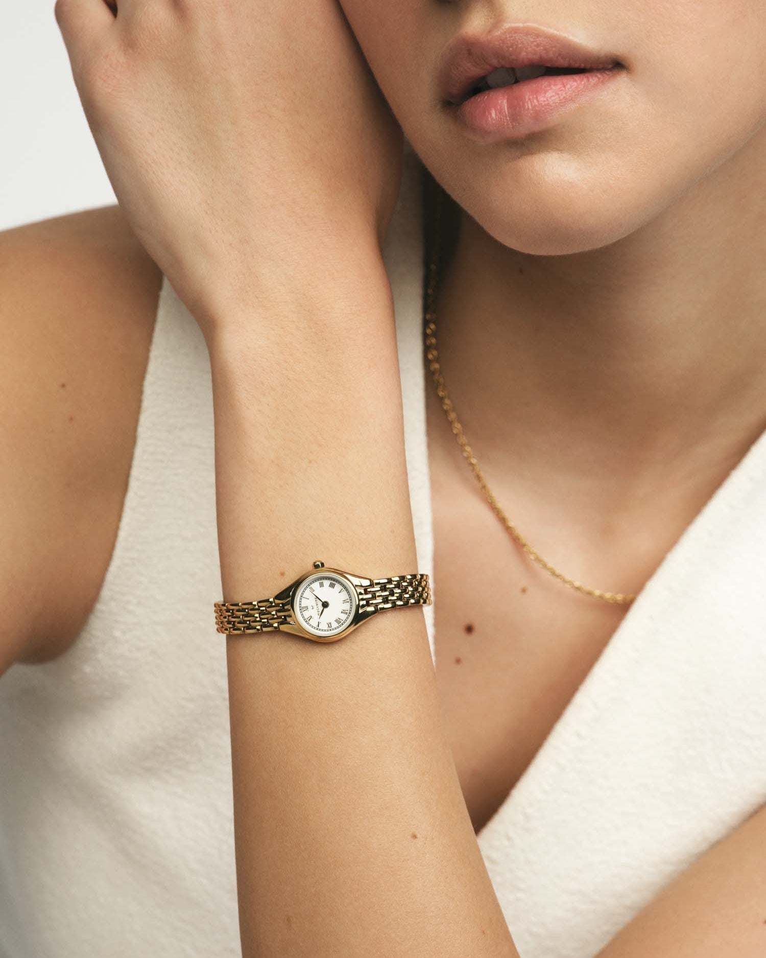A modern interpretation of classic femininity. The Heritage Watch is designed to be worn like a piece of jewelry – with its delicate silhouette, Roman numerals, and gleaming gold-toned link bracelet, it’s a sophisticated complement to both everyday looks and festive occasions.