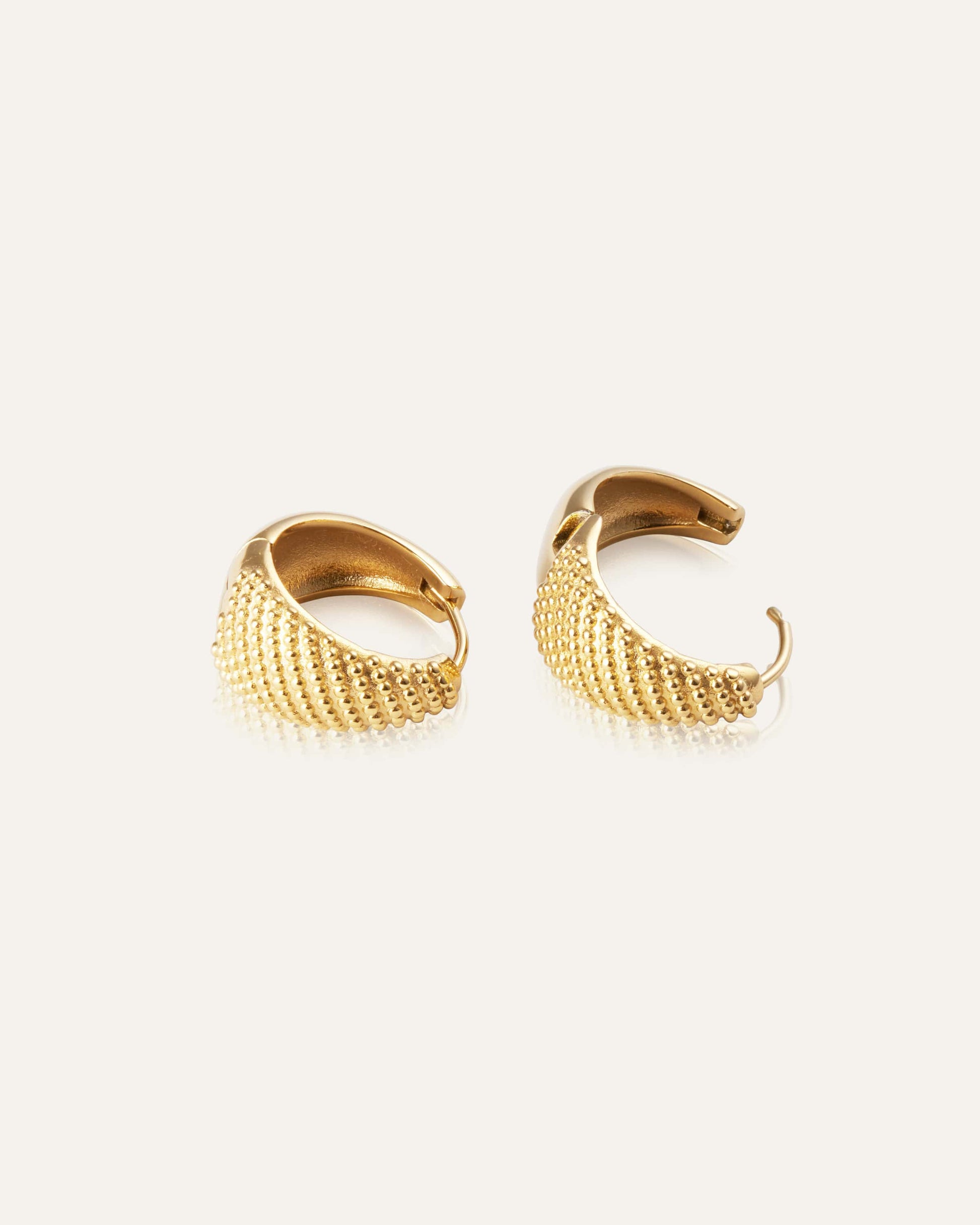 Honey Hoops feature a unique design with a textured pattern that sets them apart from the classic Bold Hoops. Crafted from solid stainless steel with 18K gold PVD plating, they are both durable and water-resistant.
