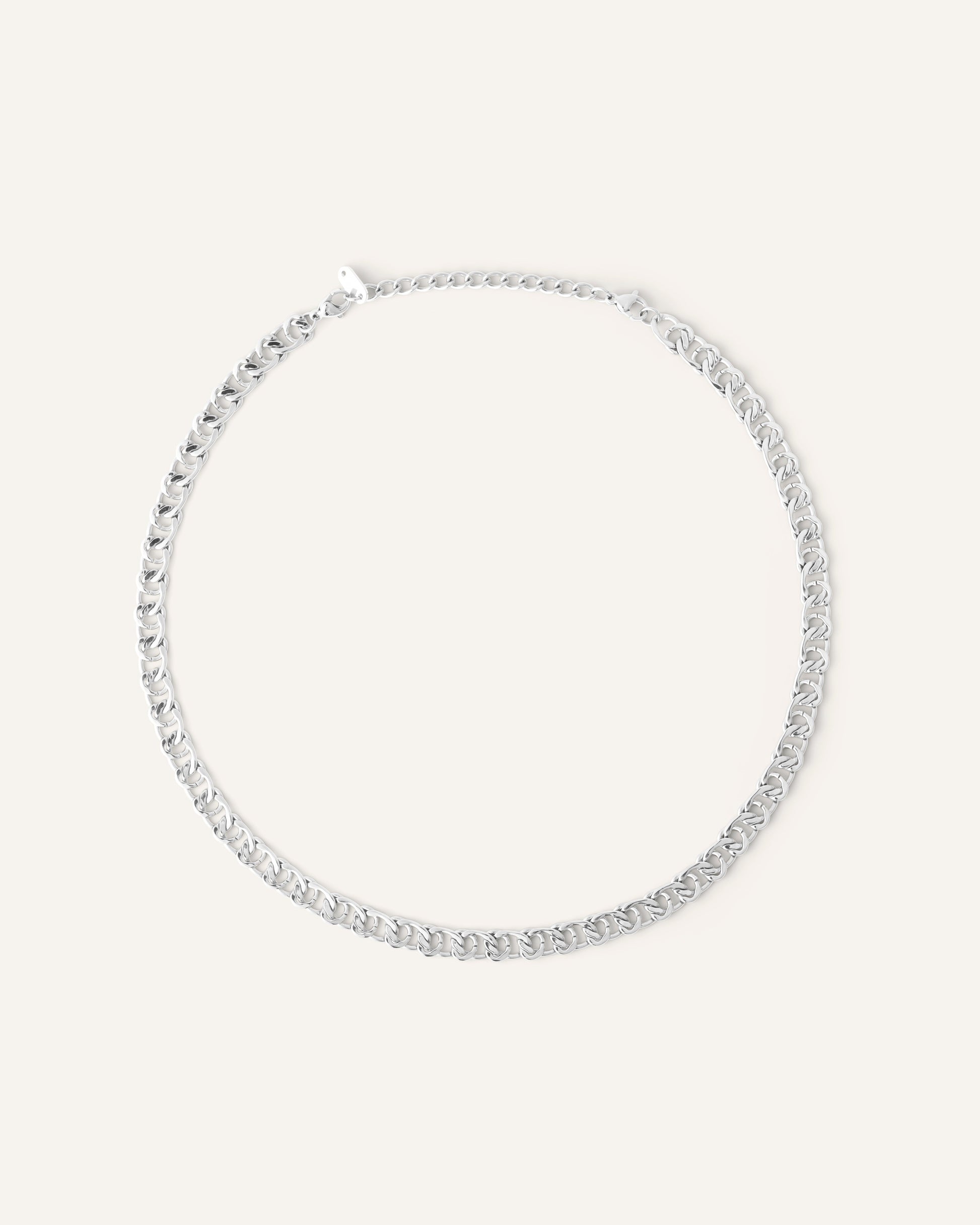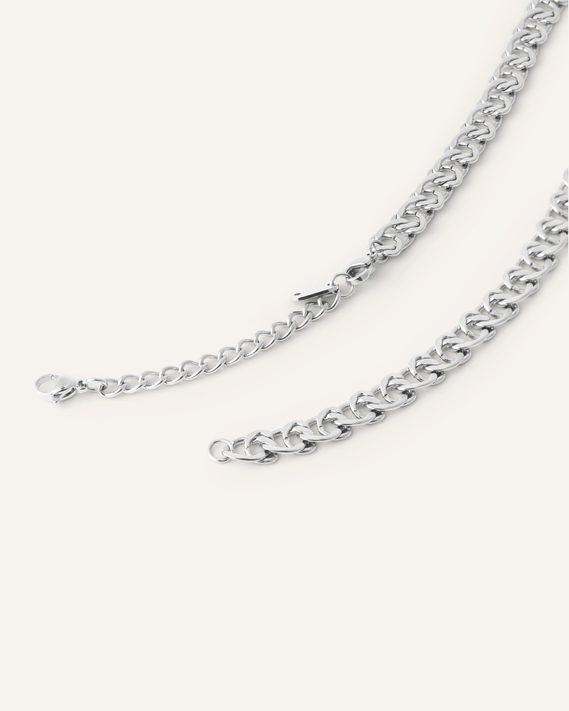 More chain, same clean expression. Infinity Necklace in a wider curb chain creates a distinct, harmonious look around the neck. Crafted from stainless steel in a silver tone that withstands daily wear and keeps its shine. Water-resistant and easy to adjust—the extension chain can be removed for a perfect fit.