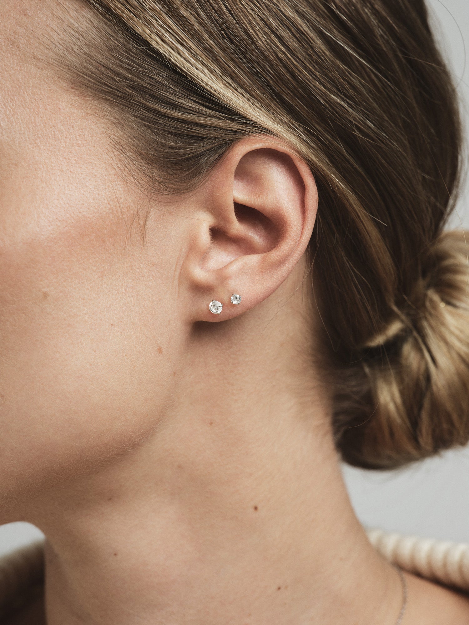 Timeless elegance in a minimalist design. Jolie White Studs are discreet, sparkling earrings with white cubic zirconia stones. Crafted from stainless steel for long-lasting durability and brilliance.