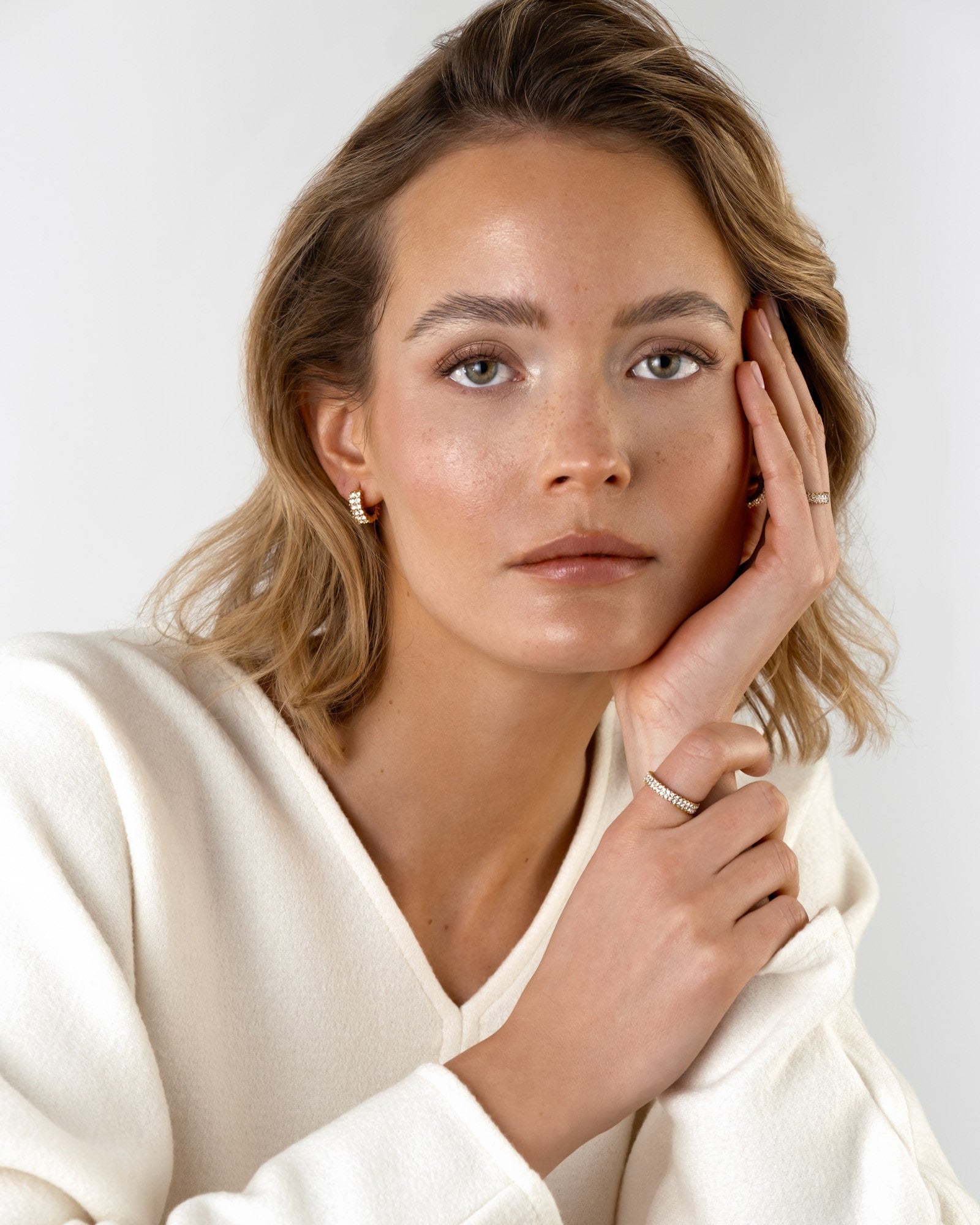Classic ring covered with small sparkling cubic zirconia stones. Made from stainless steel with 18K gold PVD plating, it is water-resistant and durable. Wear it every day – swim, shower, and work out without worrying about it losing its color.