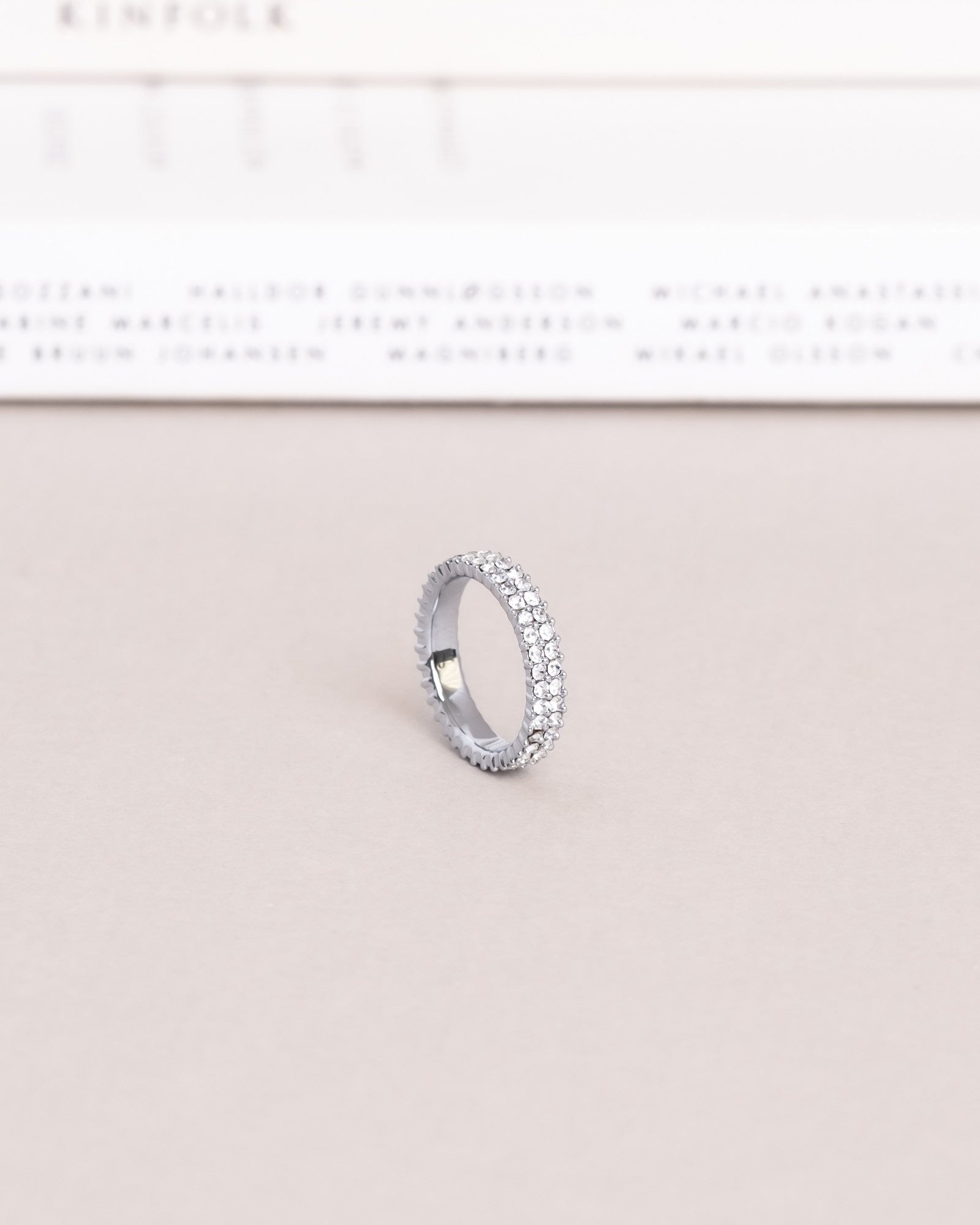 Classic ring covered with small sparkling cubic zirconia stones. Made from stainless steel with PVD plating, it is water-resistant and durable. Wear it every day – swim, shower, and work out without worrying about it losing its color.