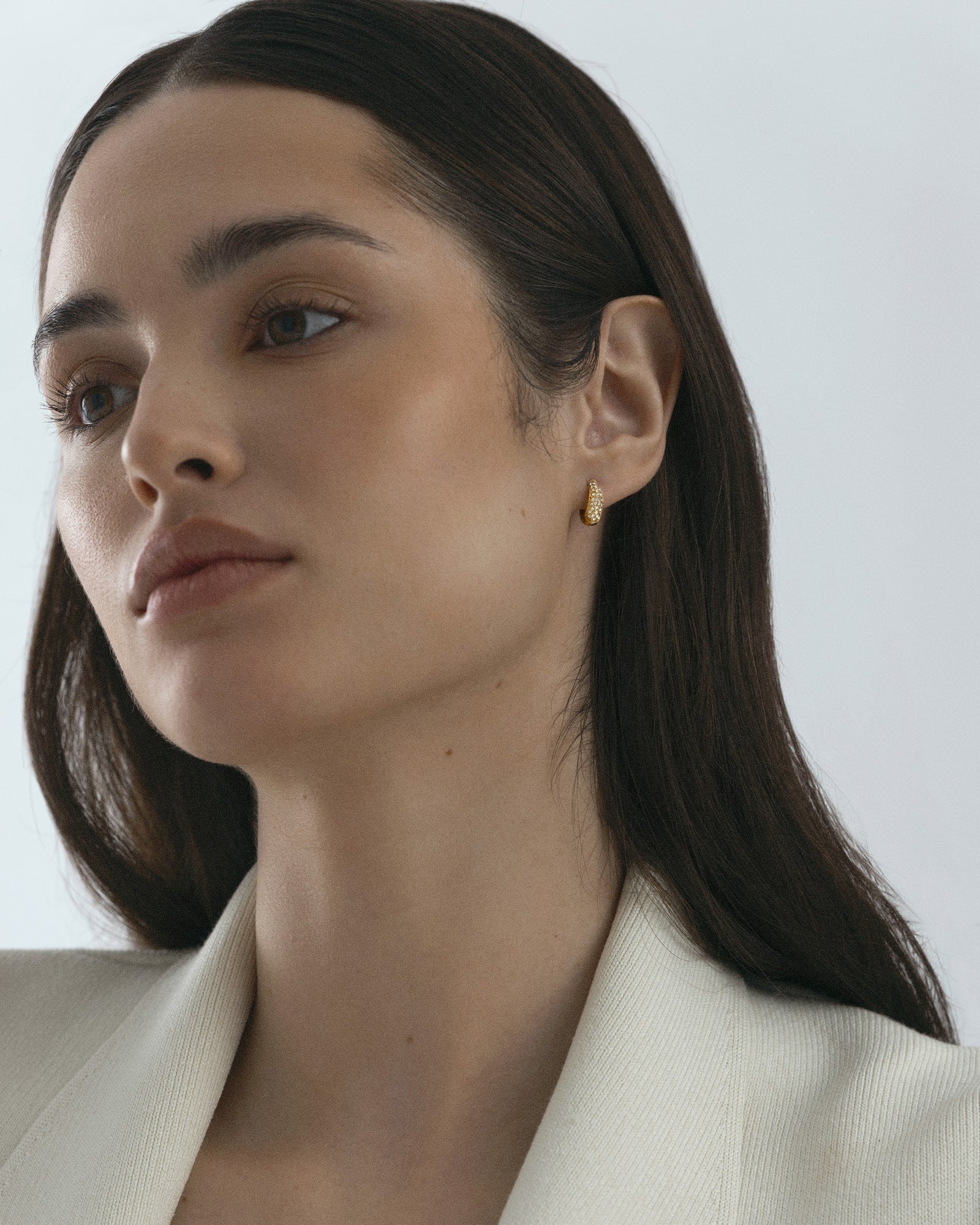 Discreet in size, maximal in elegance. The Pavé Precious Hoops are adorned with sparkling cubic zirconia stones and crafted from stainless steel with 18K gold PVD plating. Durable and water-resistant to ensure they retain their color and shine over time.