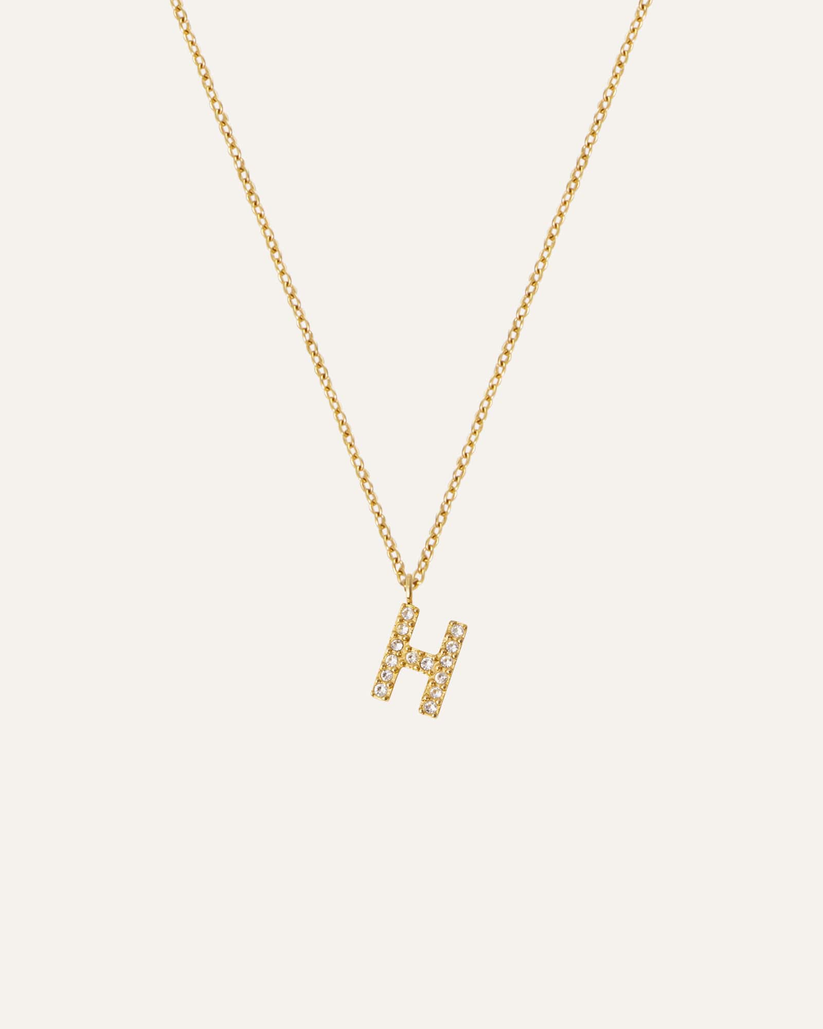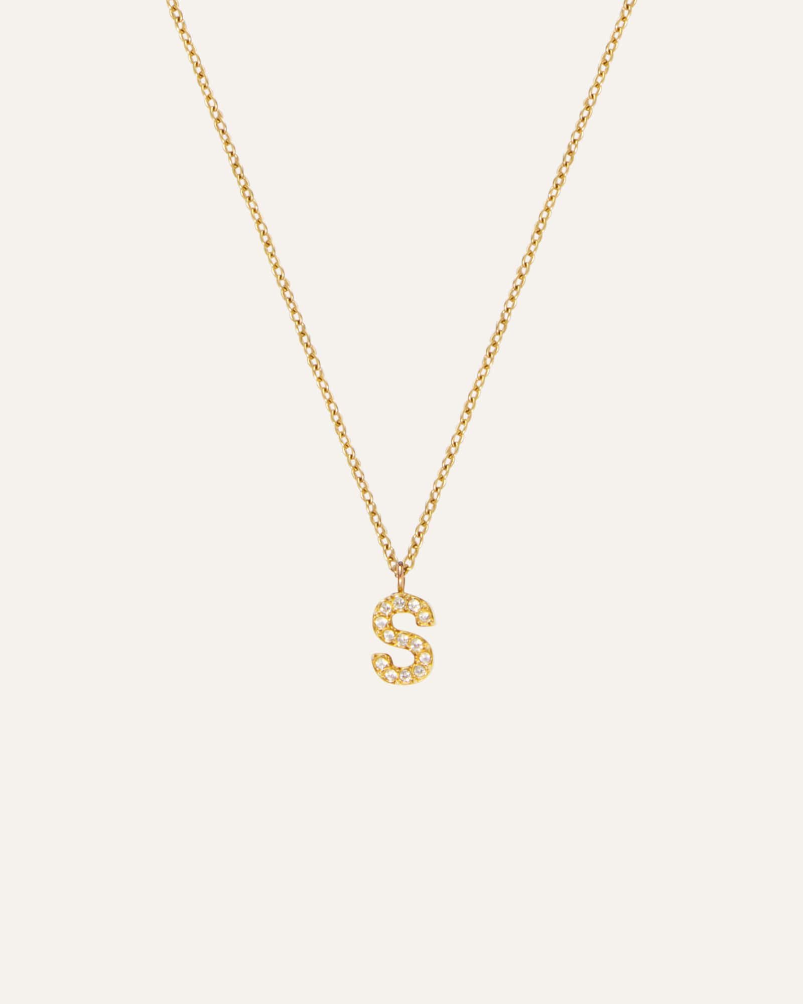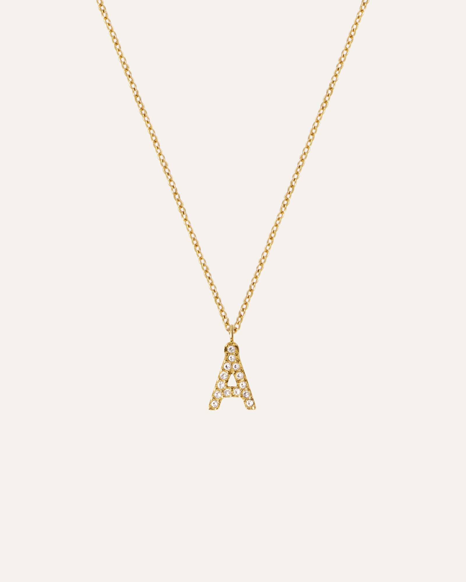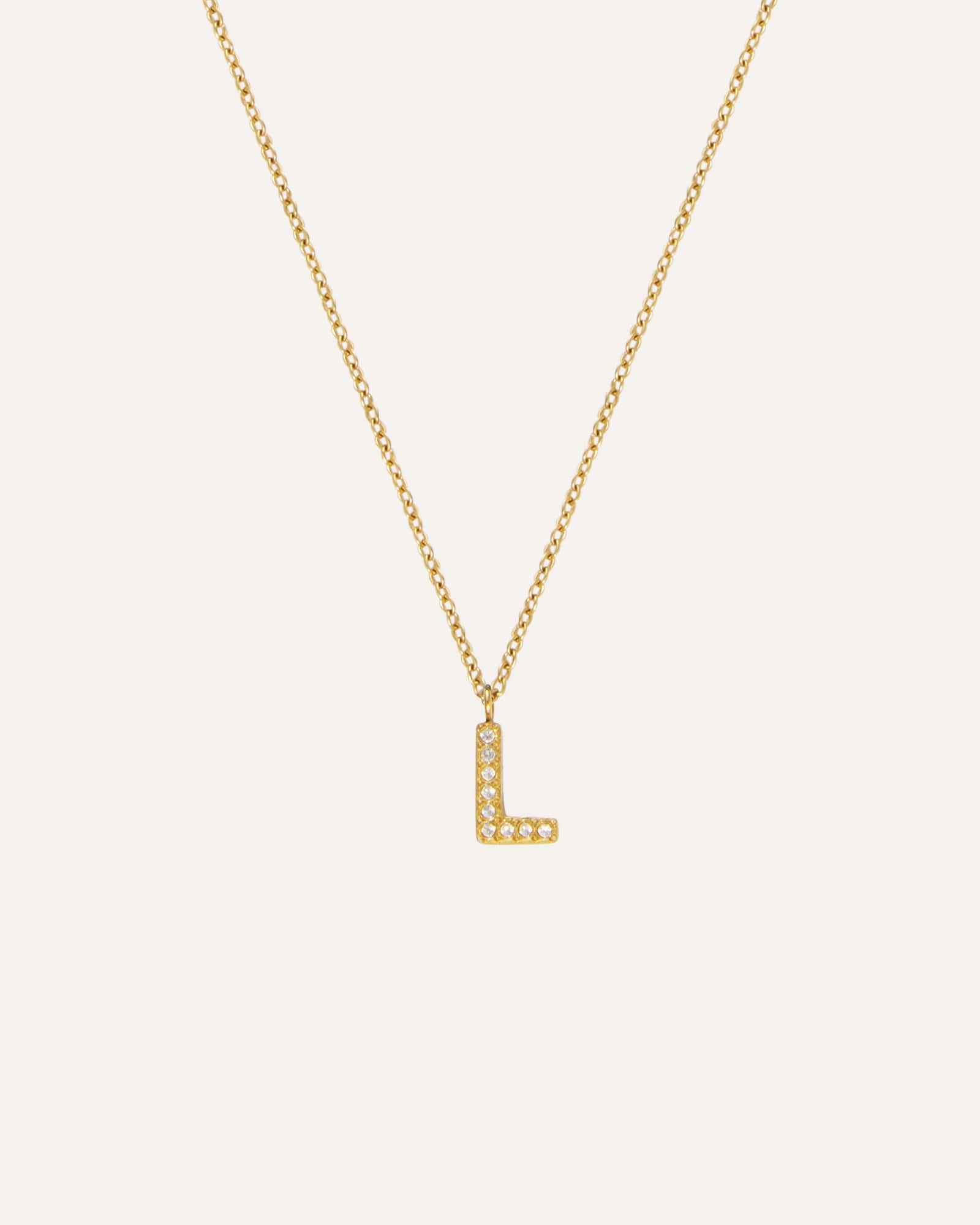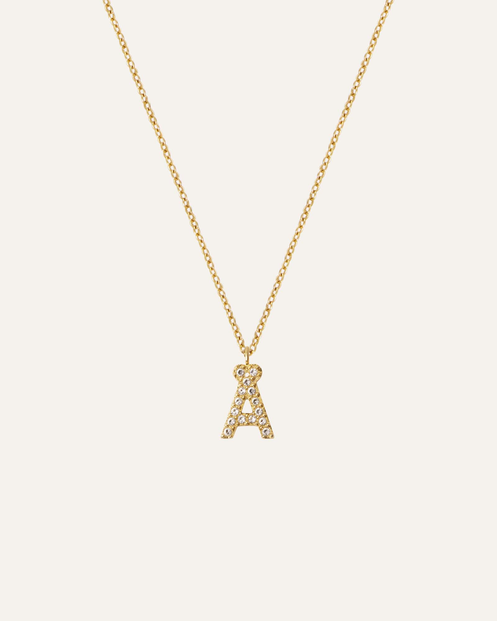 The Petite Stone Letter Necklace is an elegant and personal necklace with a thin chain and a 6 mm letter charm adorned with sparkling stones.