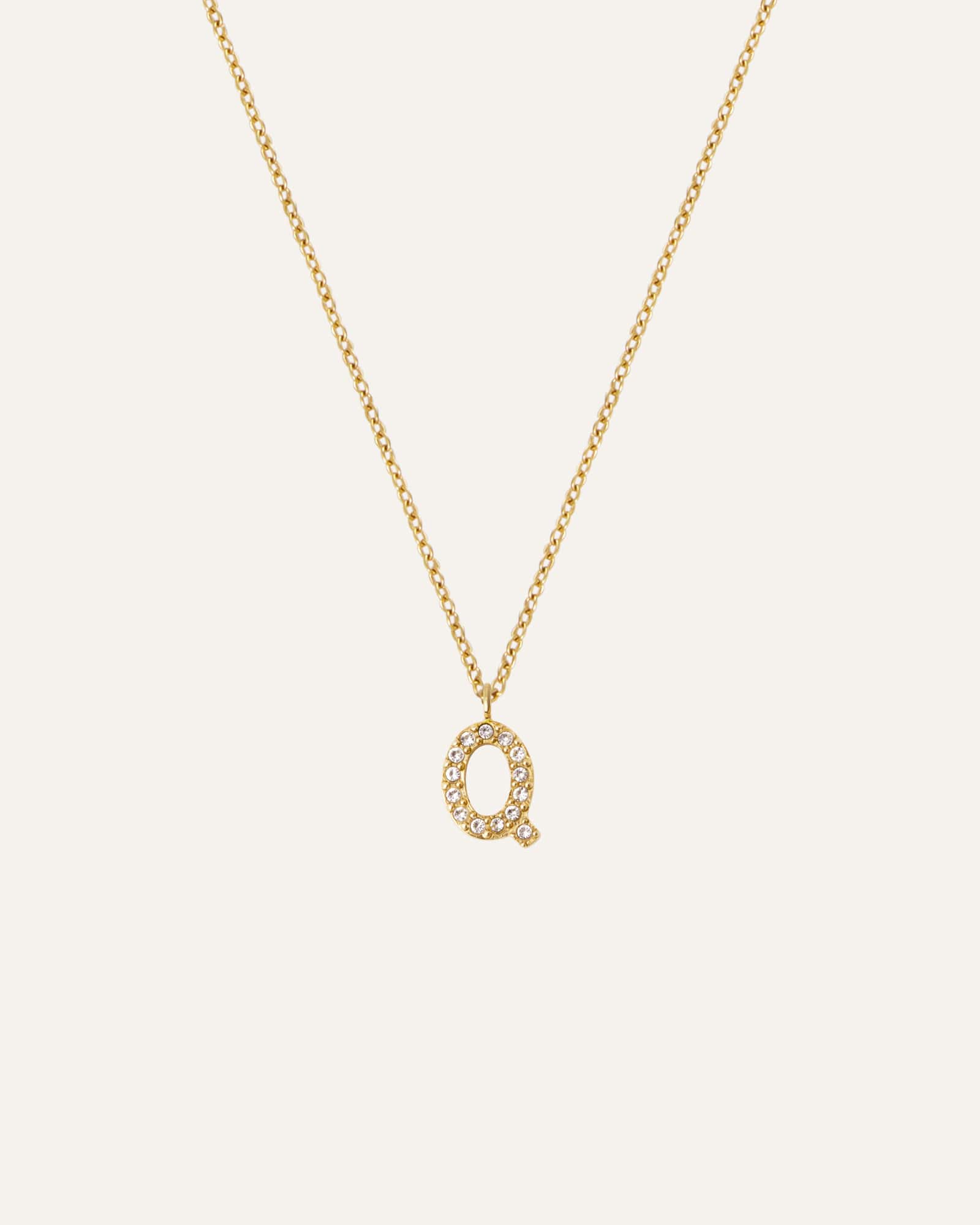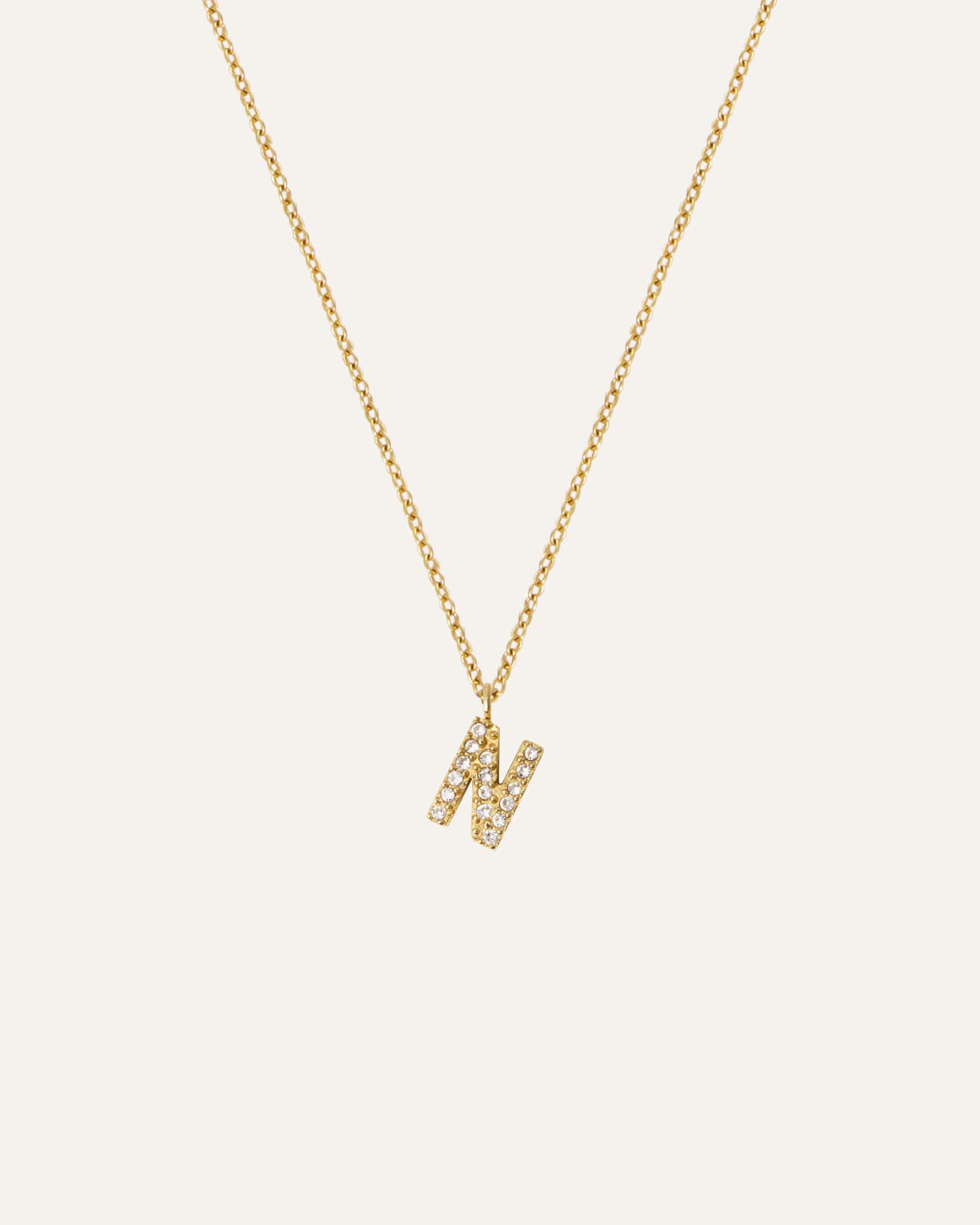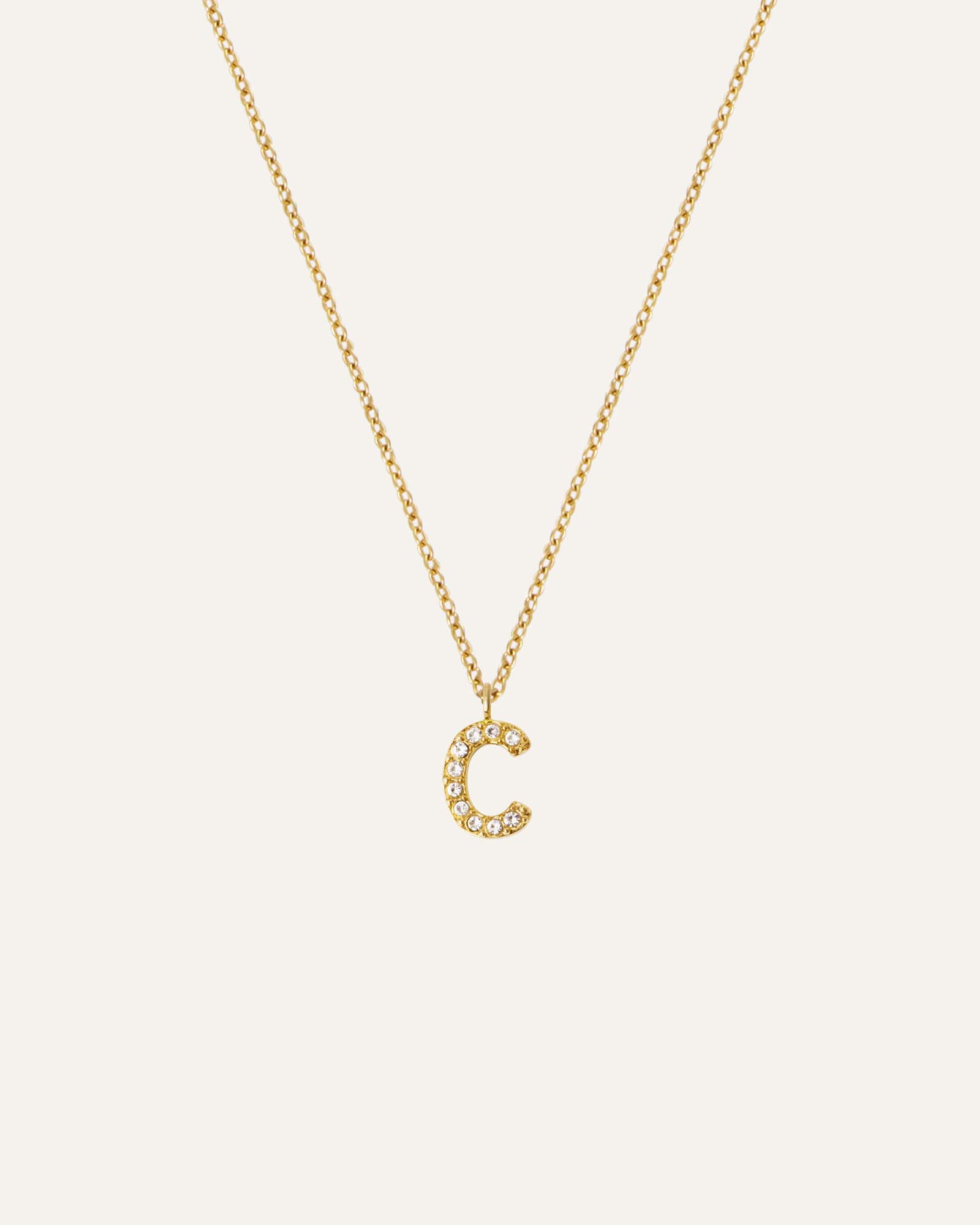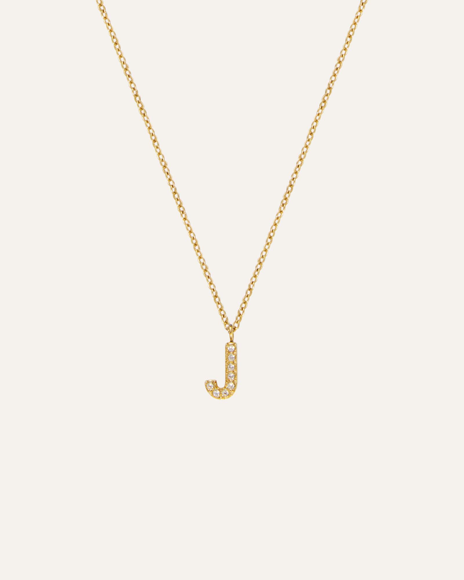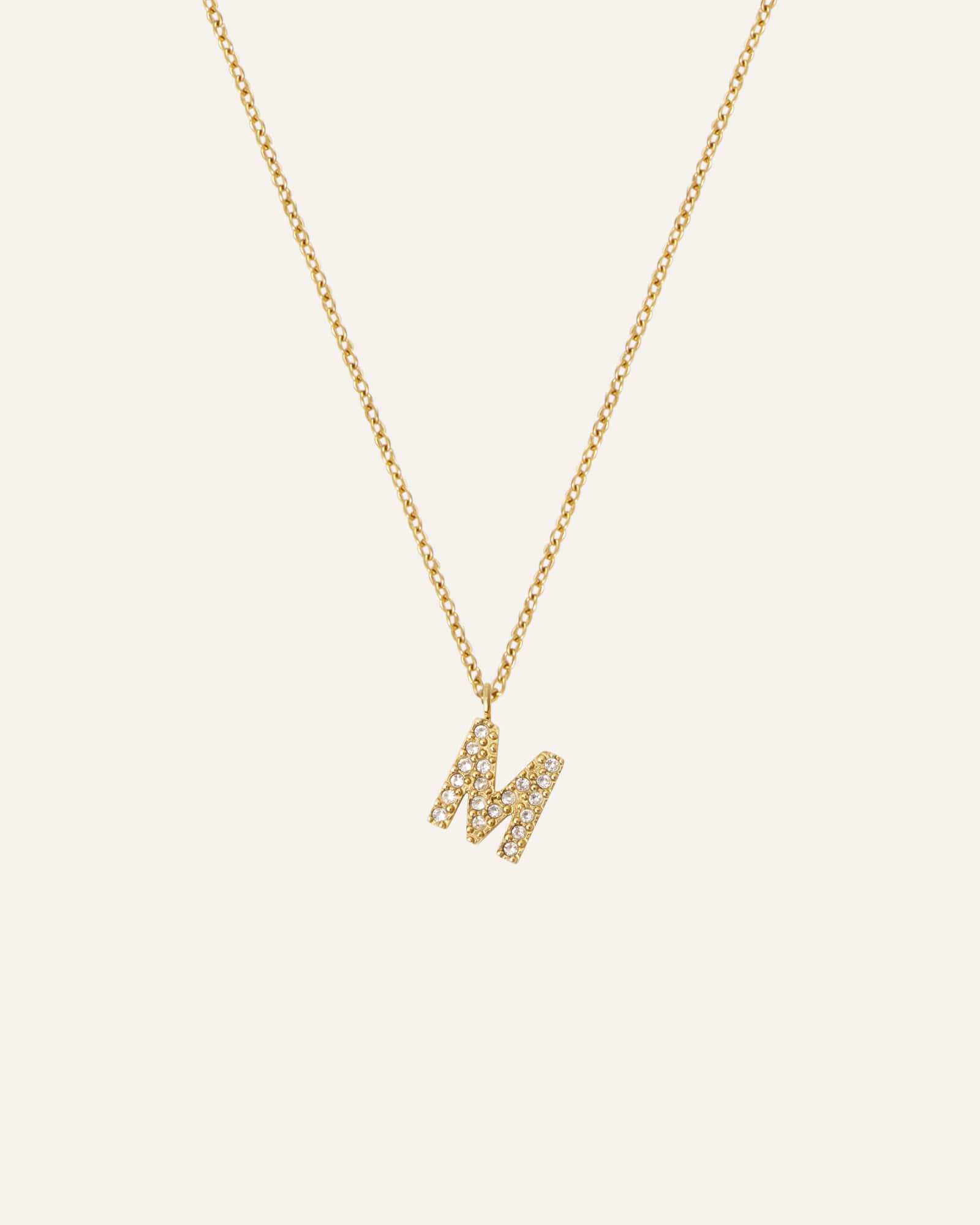 The Petite Stone Letter Necklace is an elegant and personal necklace with a thin chain and a 6 mm letter charm adorned with sparkling stones.