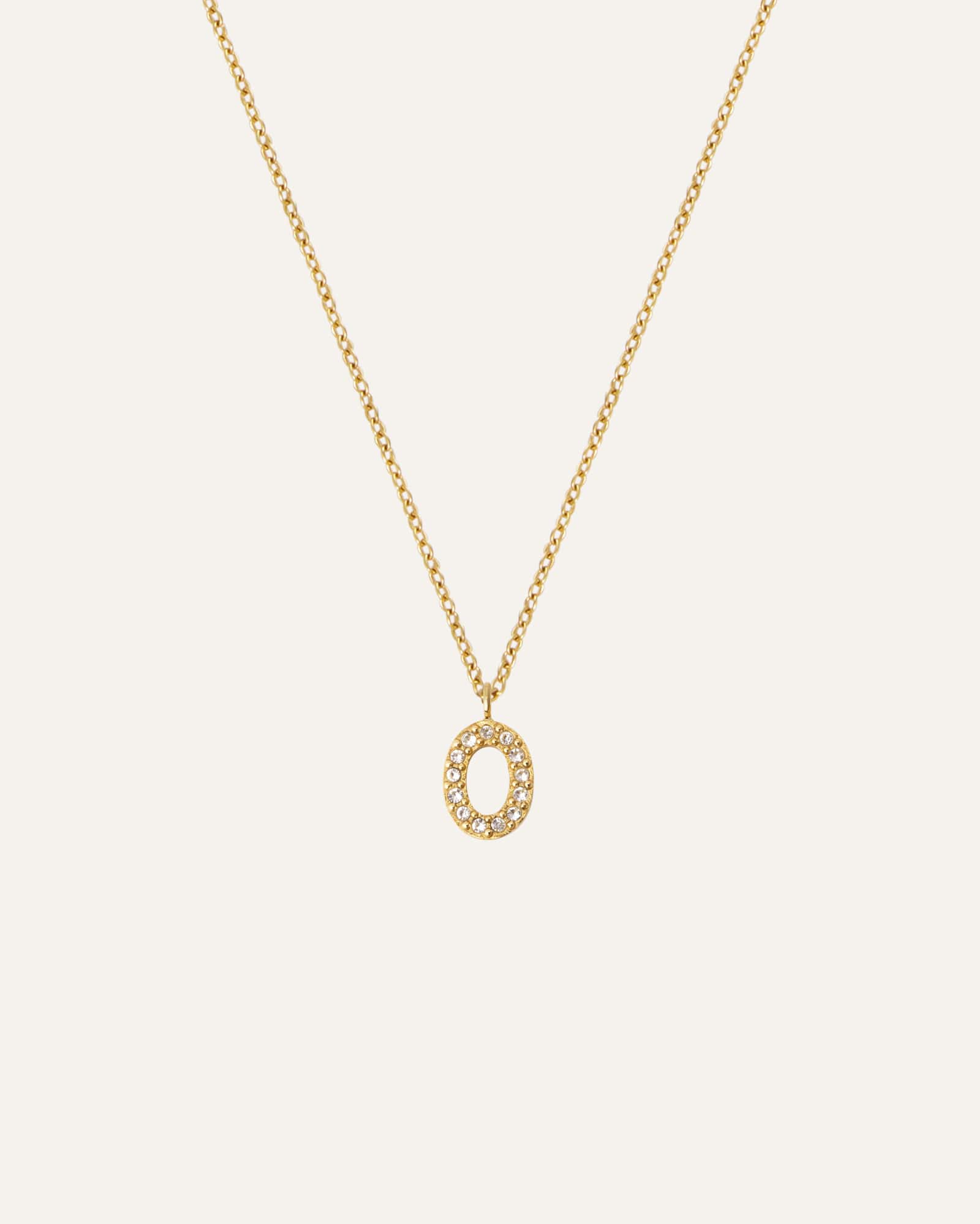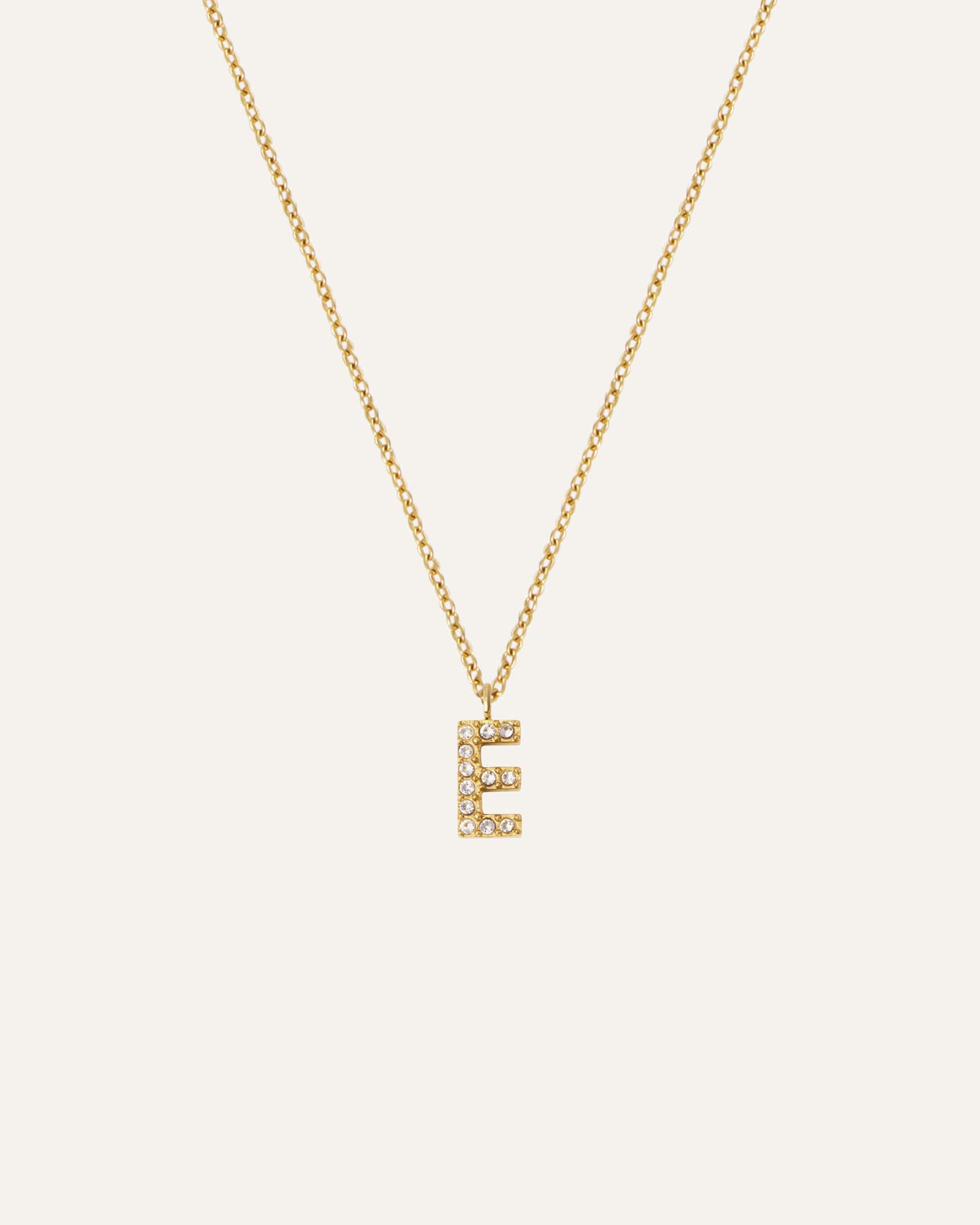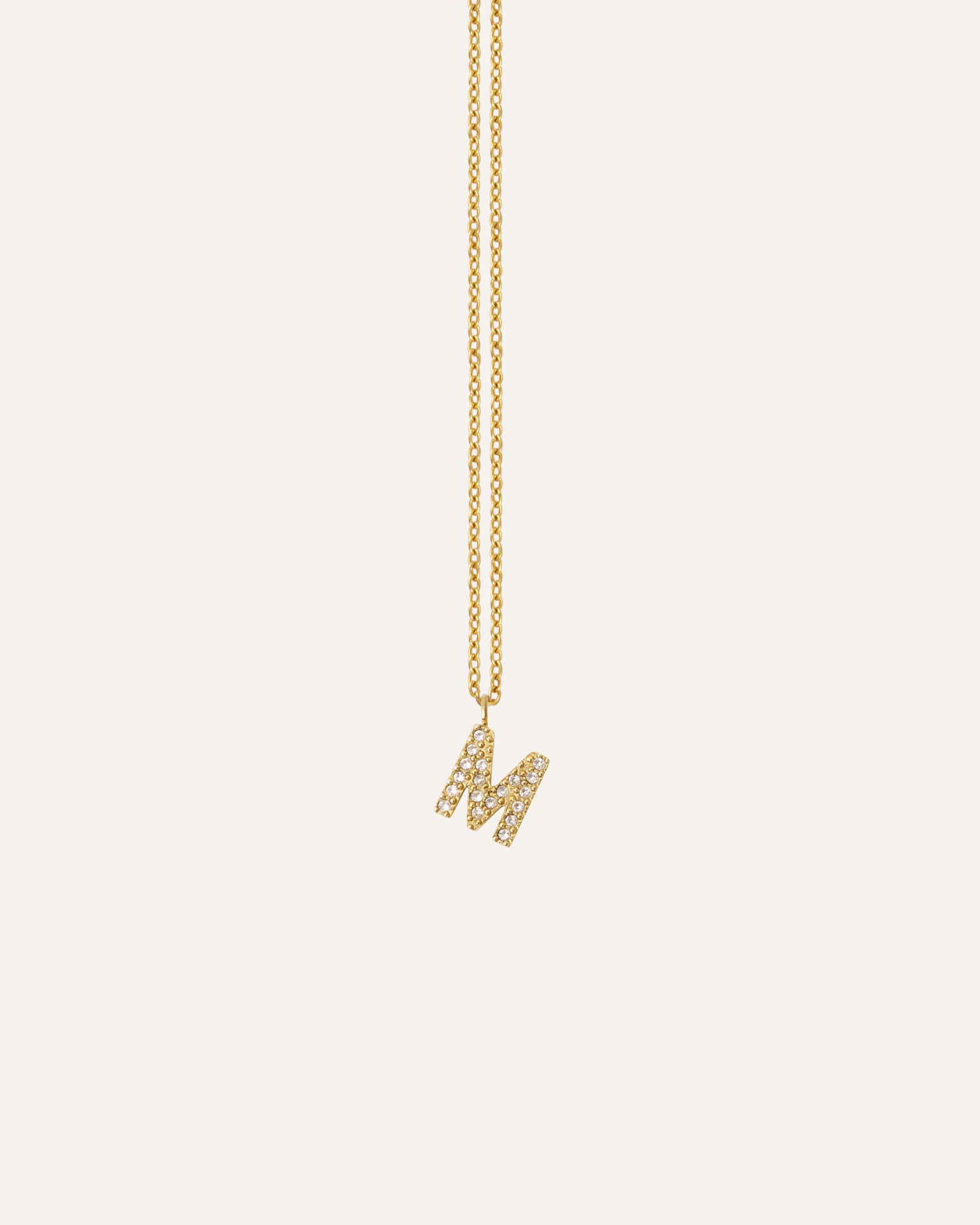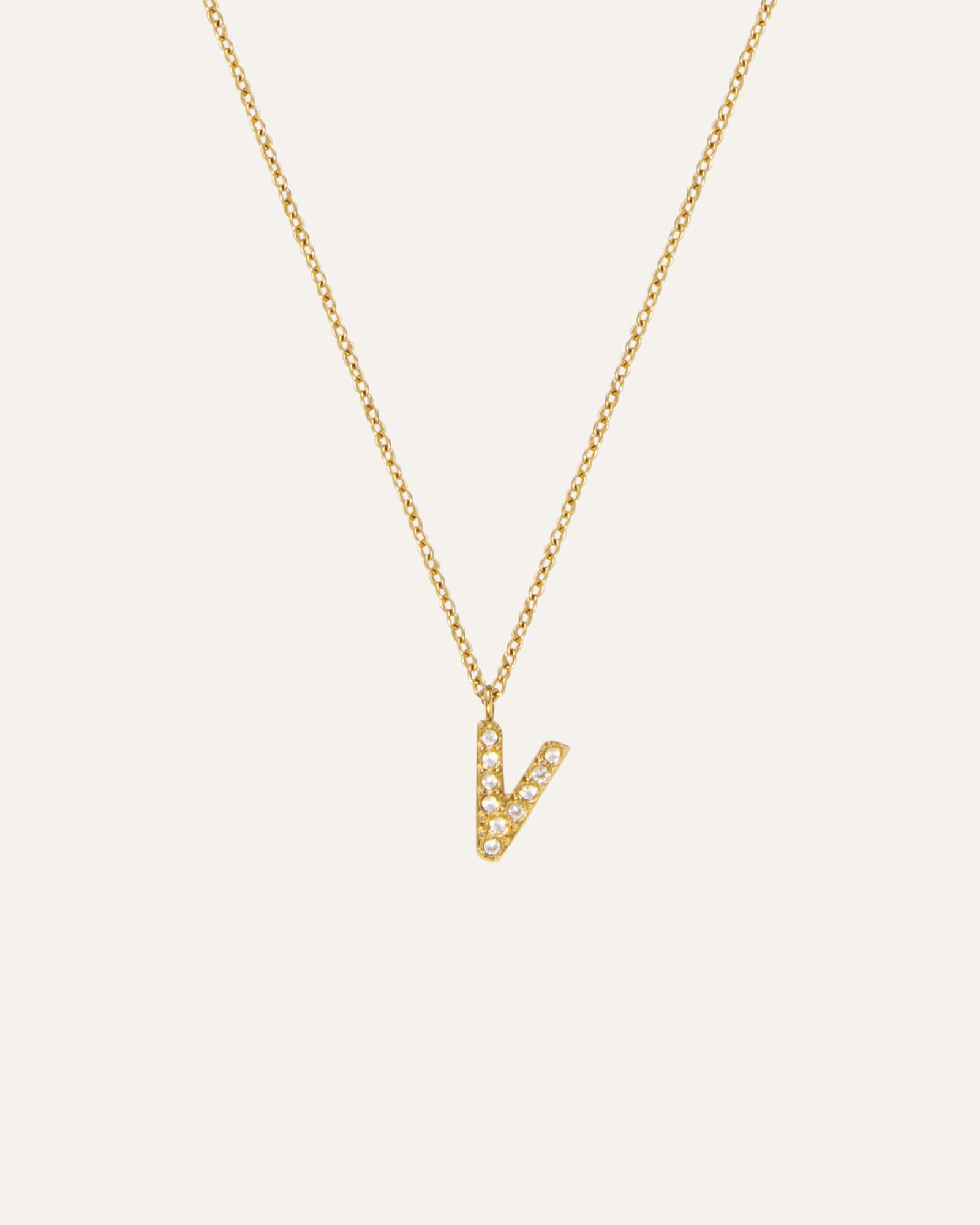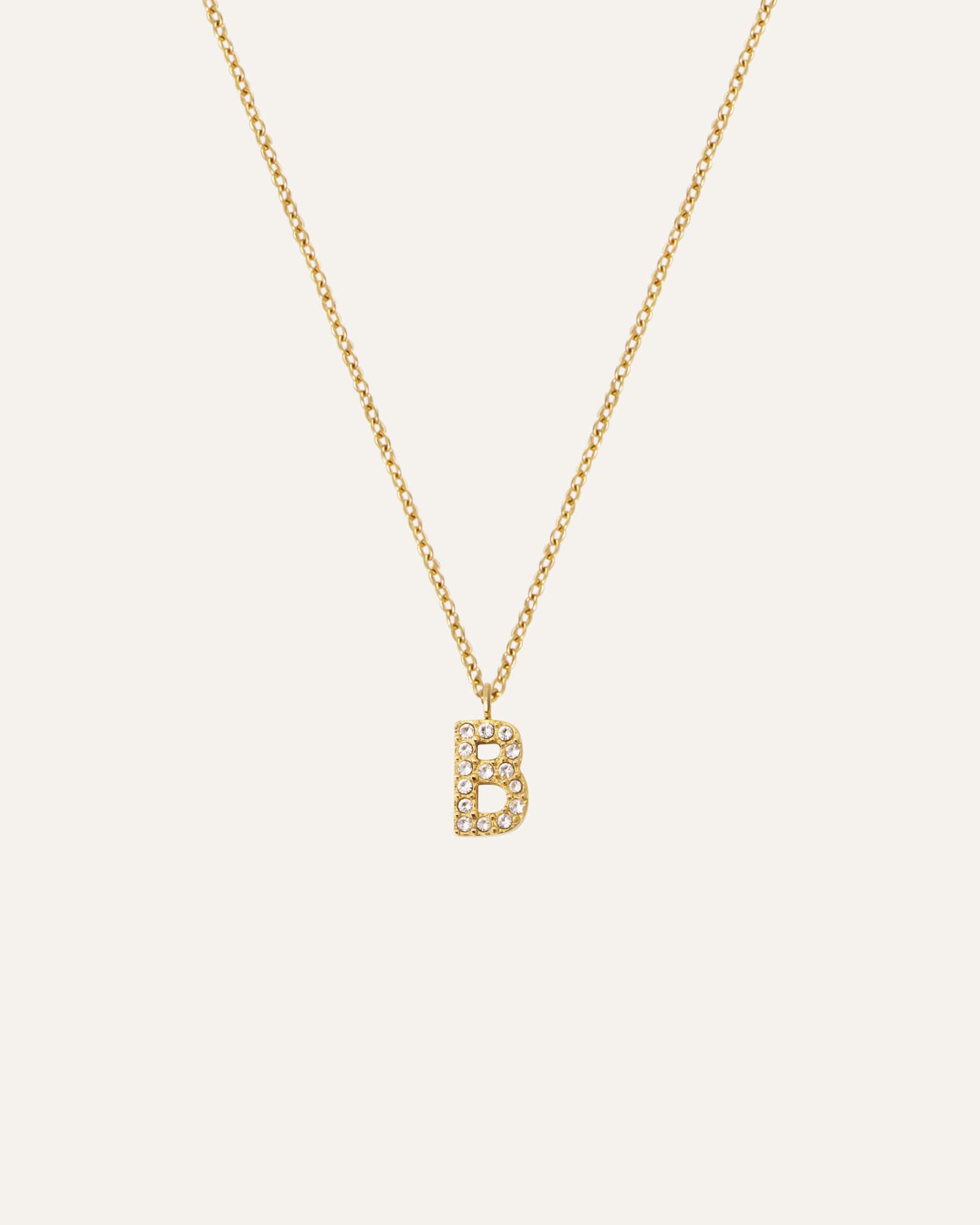 The Petite Stone Letter Necklace is an elegant and personal necklace with a thin chain and a 6 mm letter charm adorned with sparkling stones.