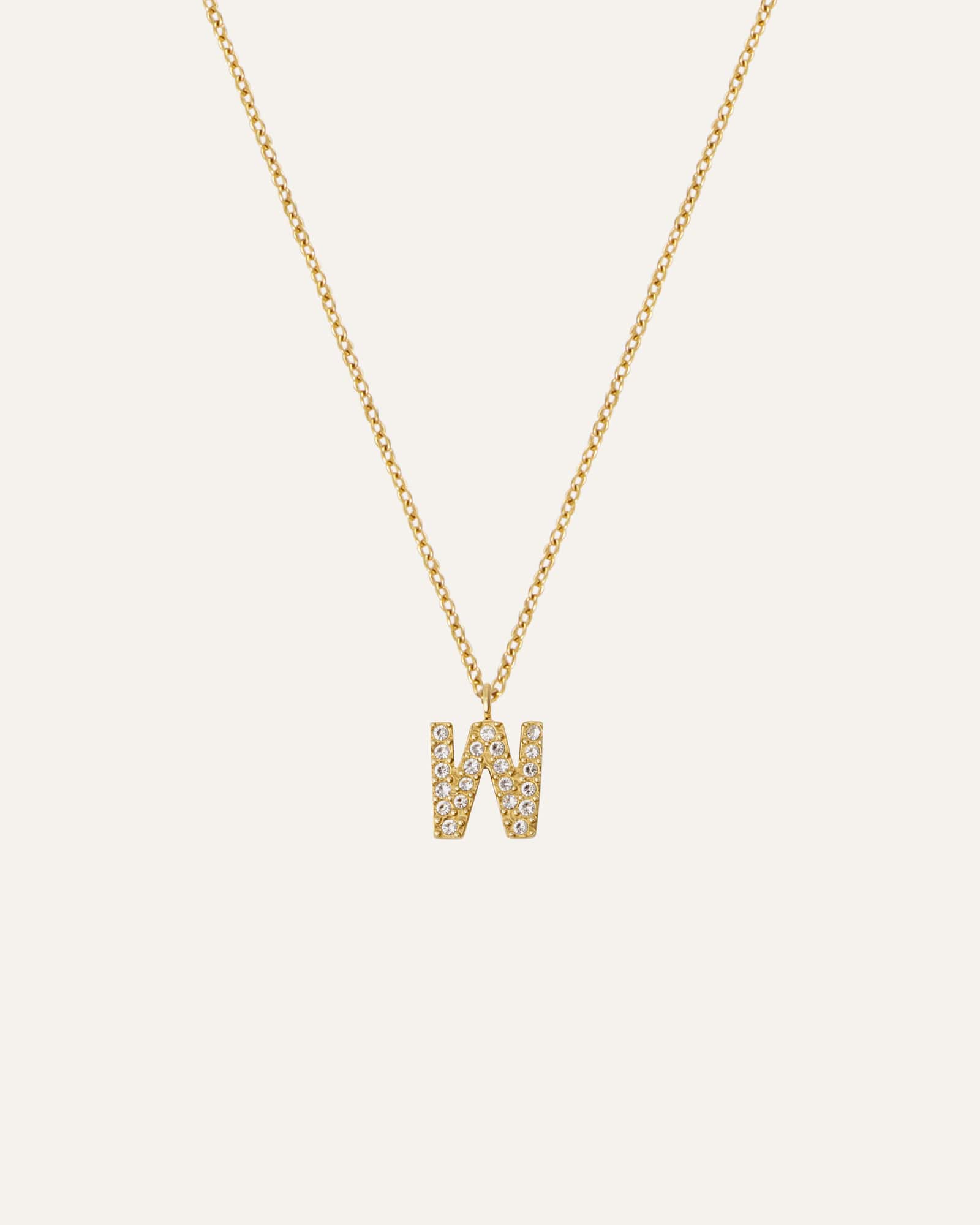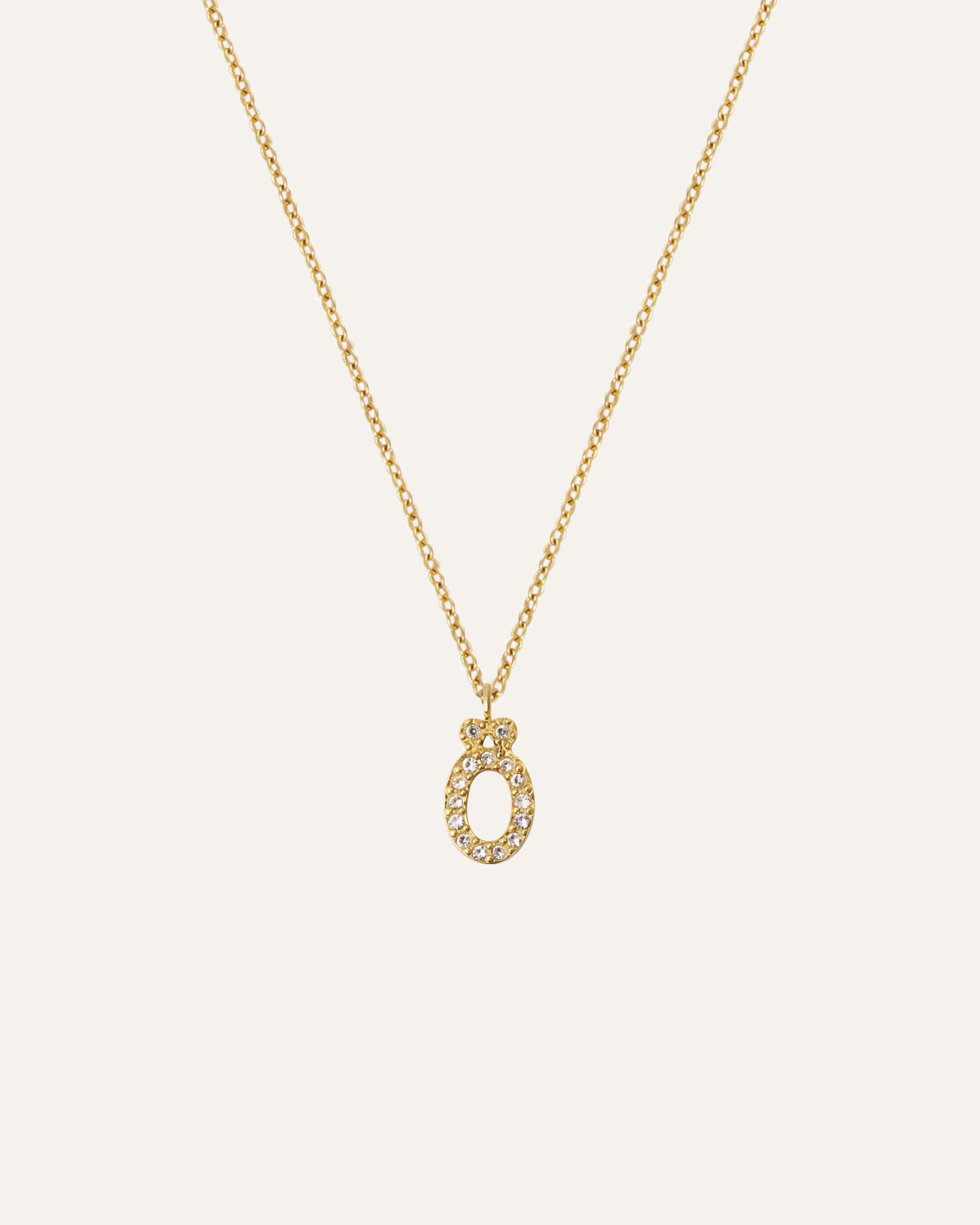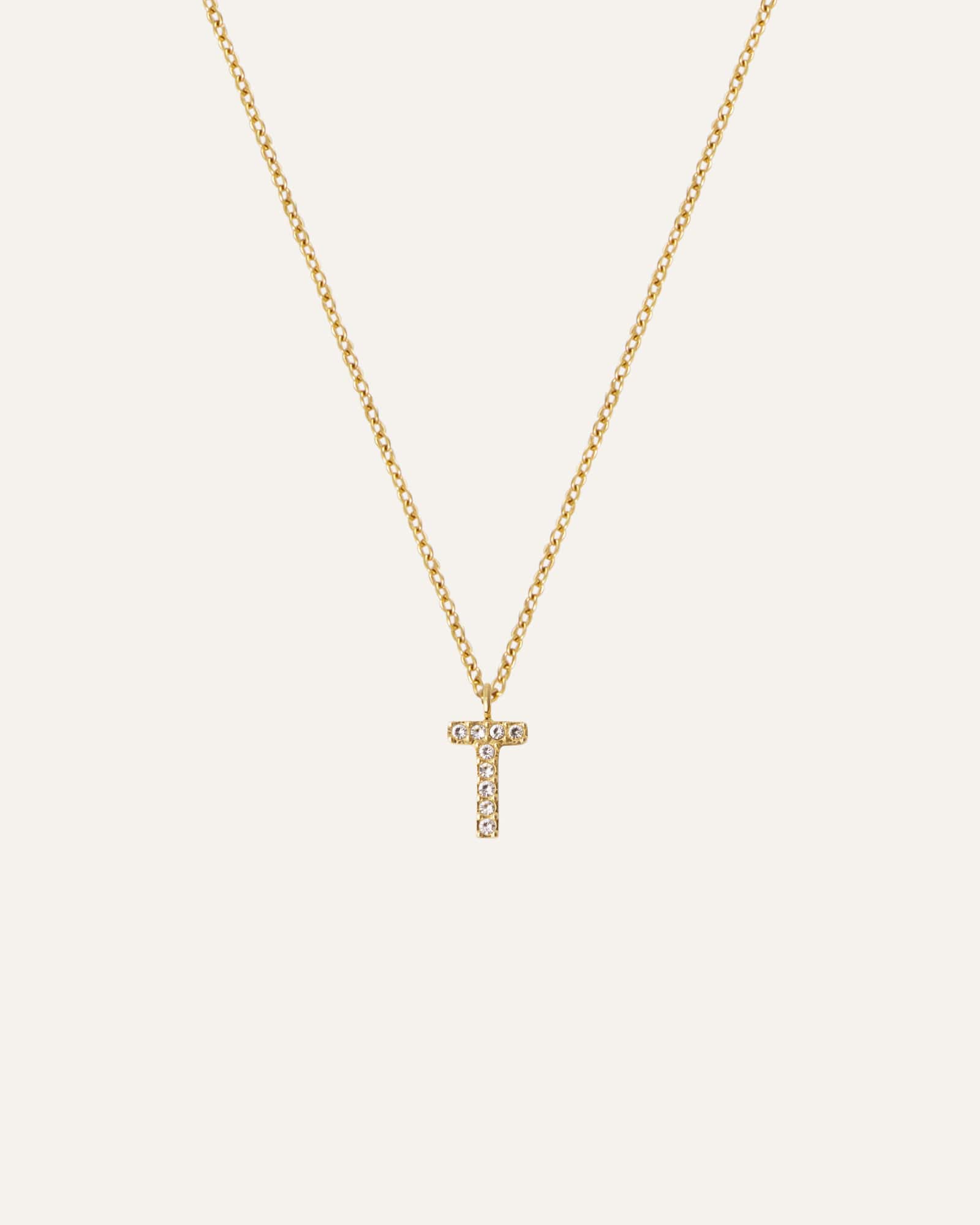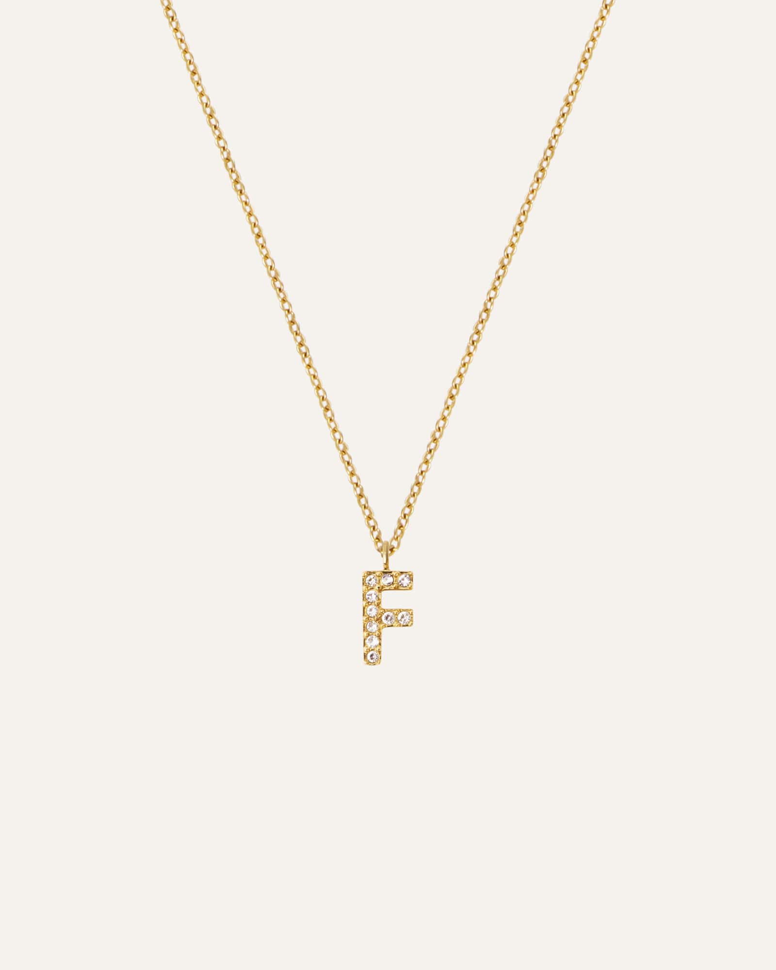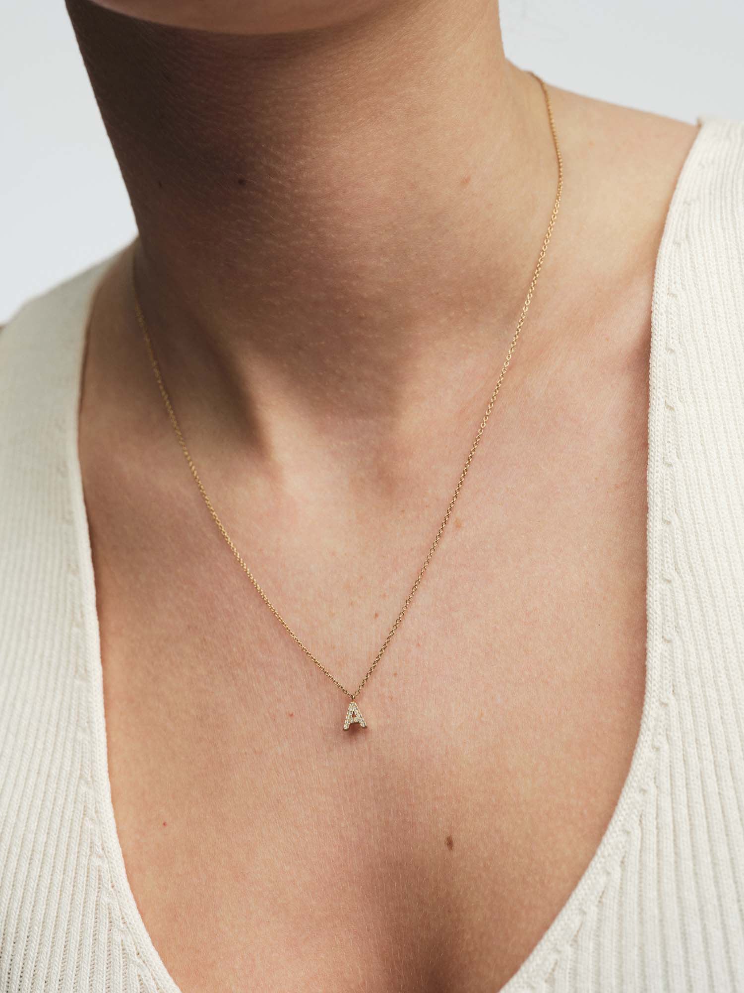 The Petite Stone Letter Necklace is an elegant and personal necklace with a thin chain and a 6 mm letter charm adorned with sparkling stones.