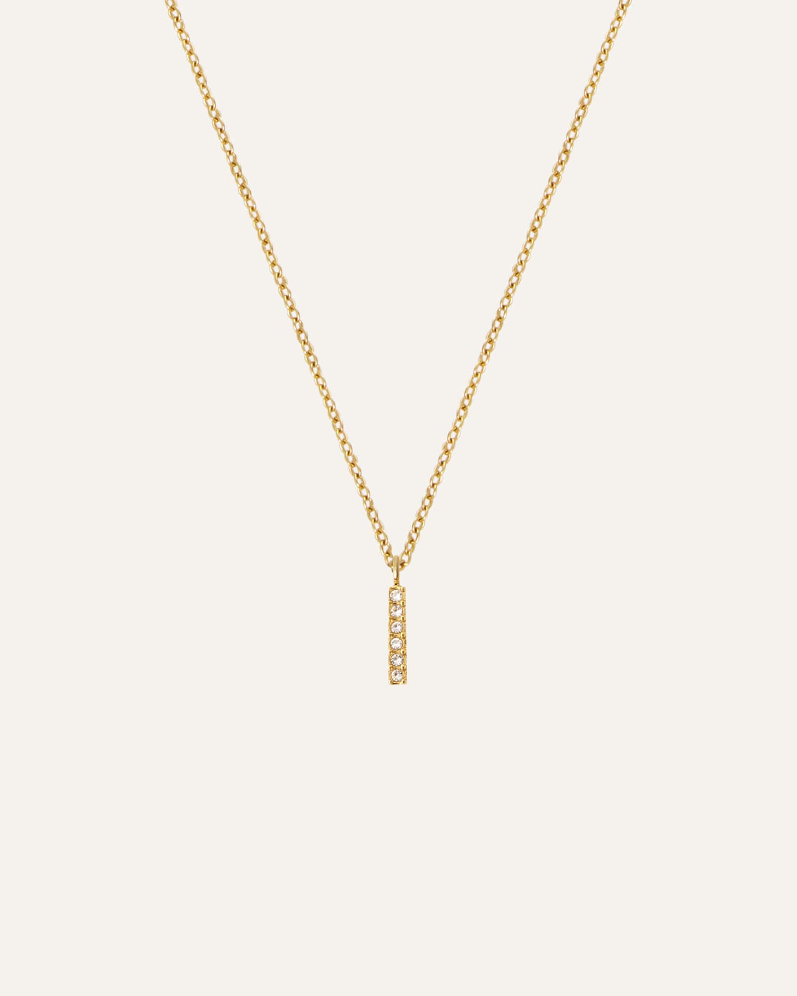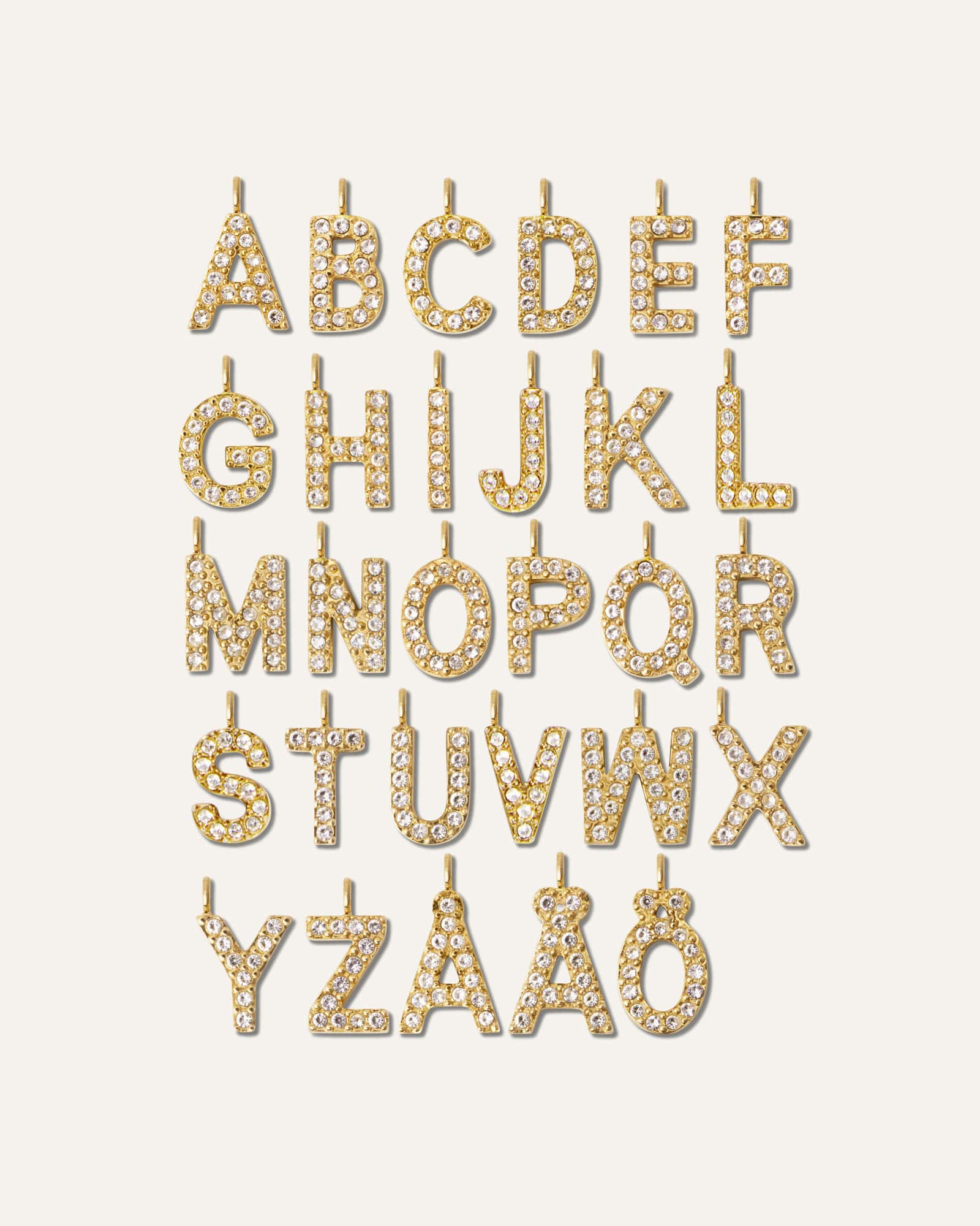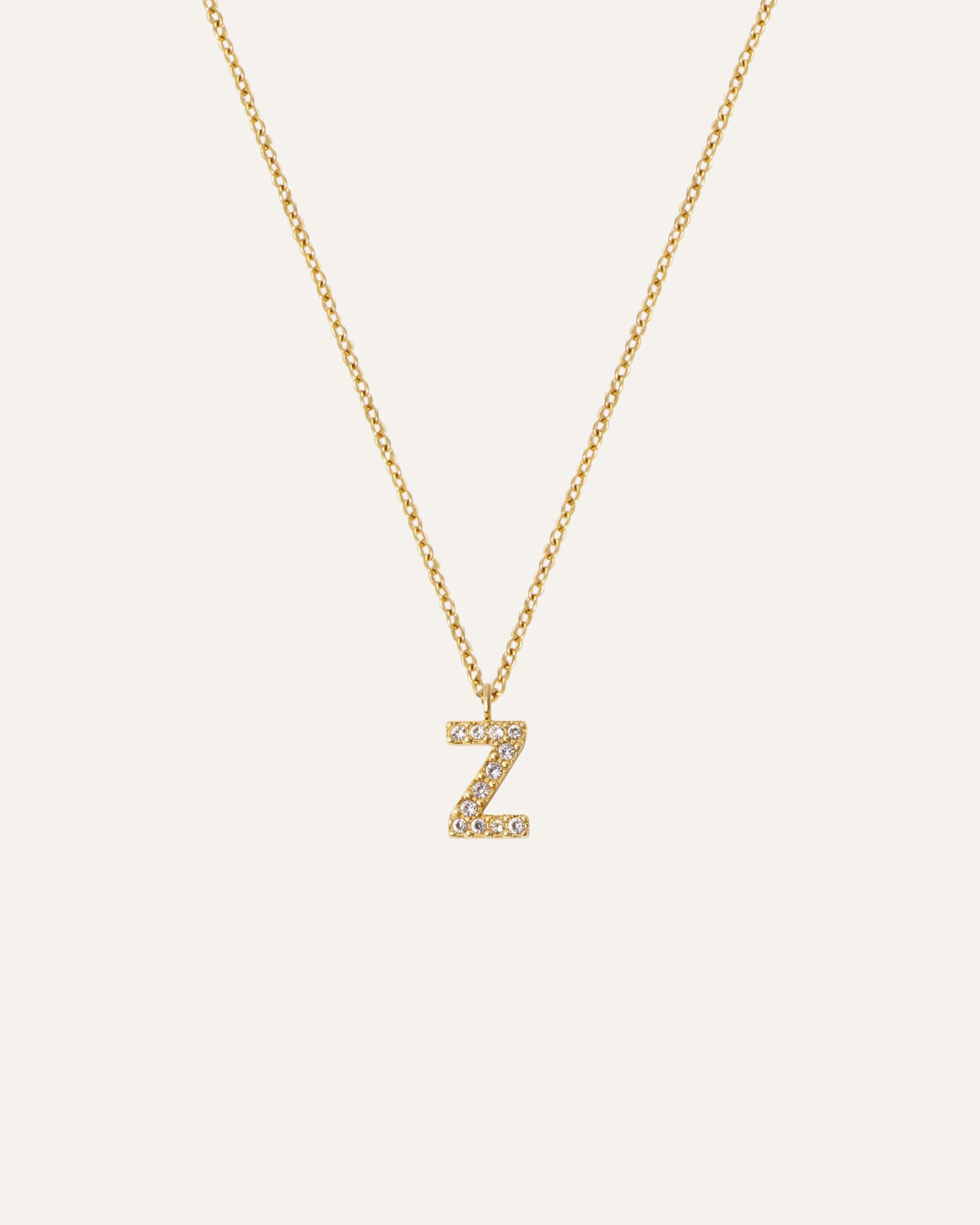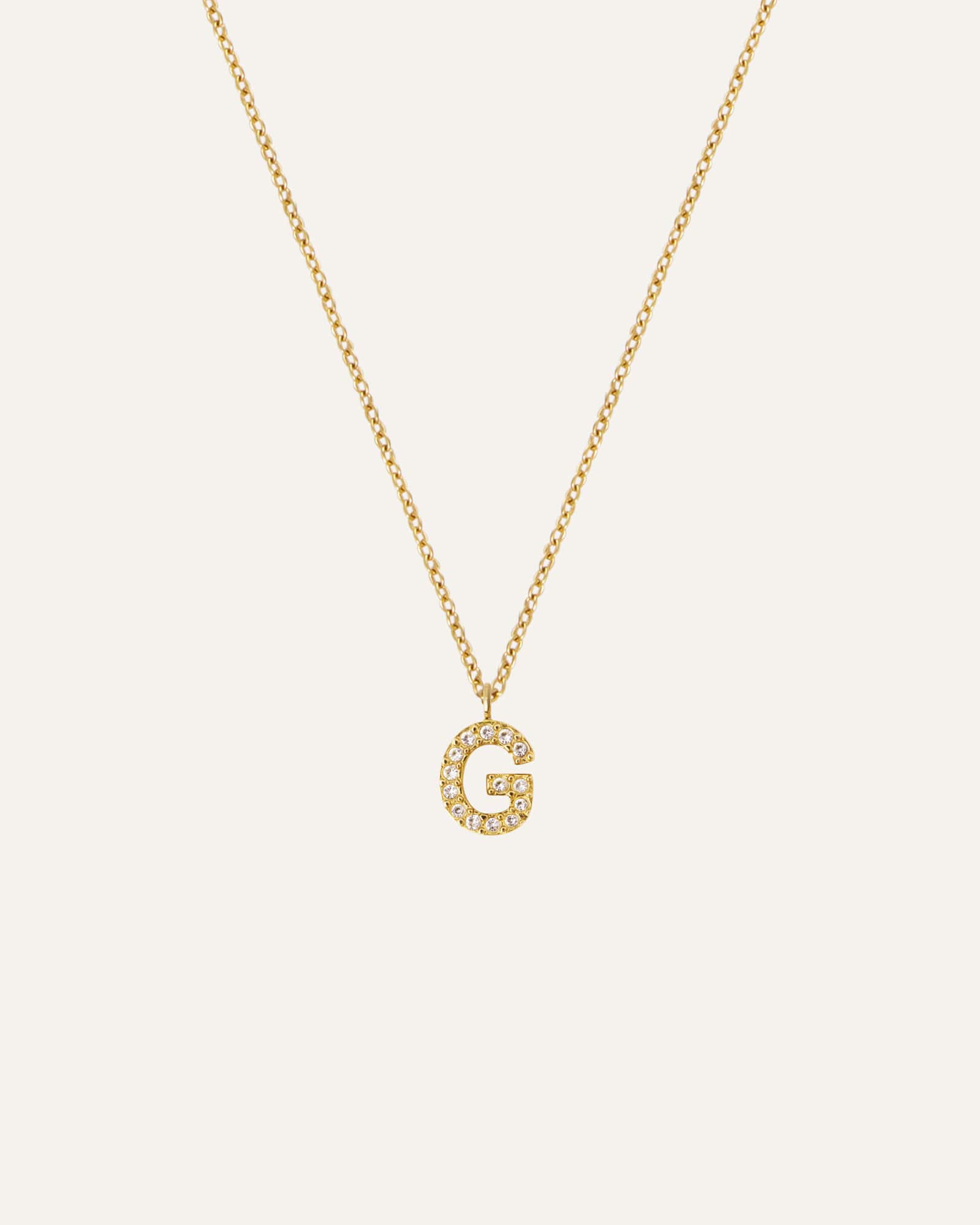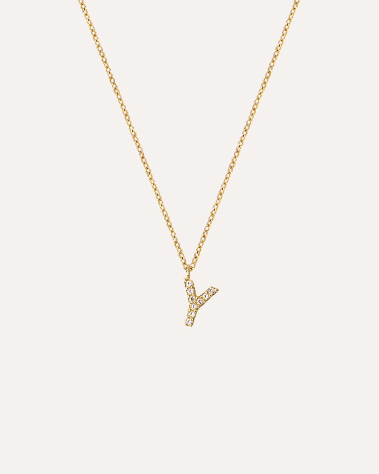 The Petite Stone Letter Necklace is an elegant and personal necklace with a thin chain and a 6 mm letter charm adorned with sparkling stones.