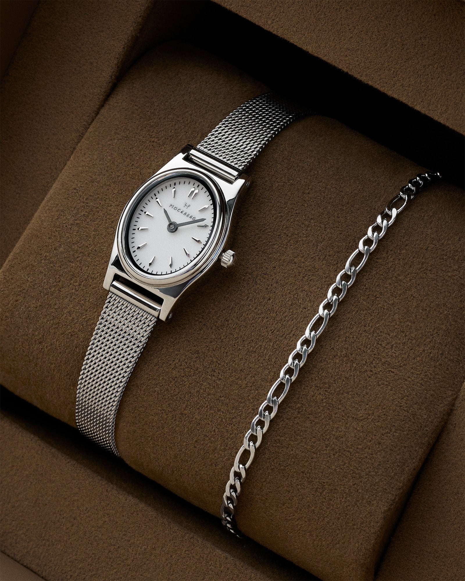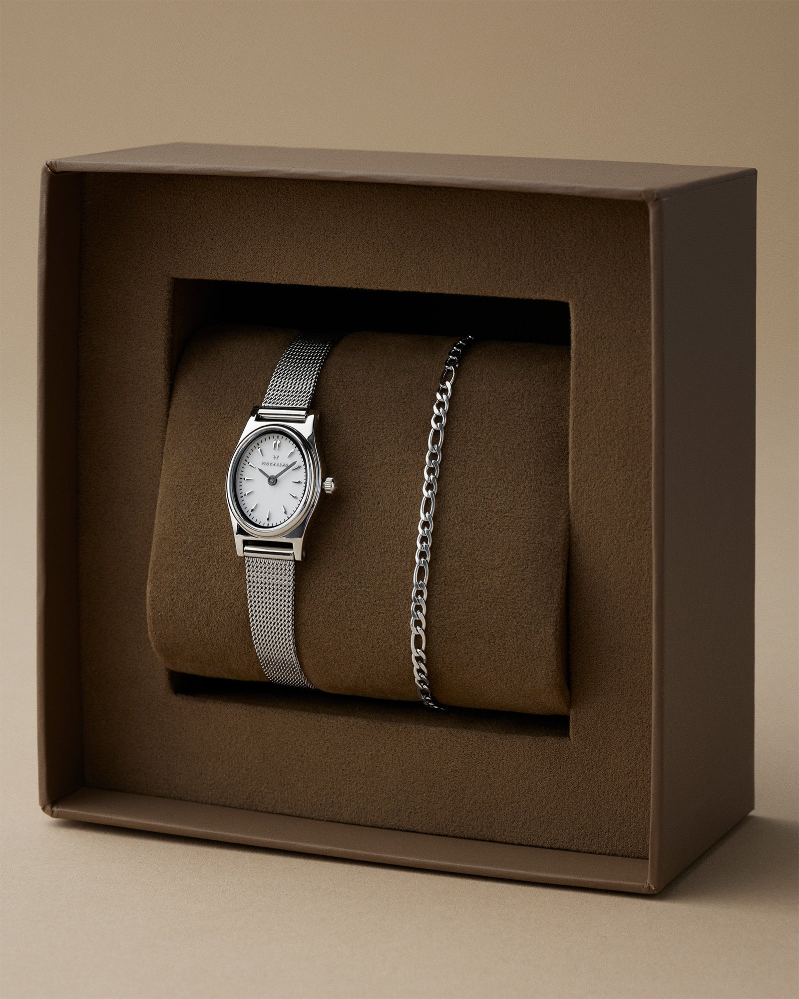 A beautiful box with our Retro Mesh watch and Thin Figaro bracelet. The combination creates the perfect vintage look that suits both everyday wear and special occasions. The watch and bracelet come in a box, making this the ultimate gift for someone you hold dear!
