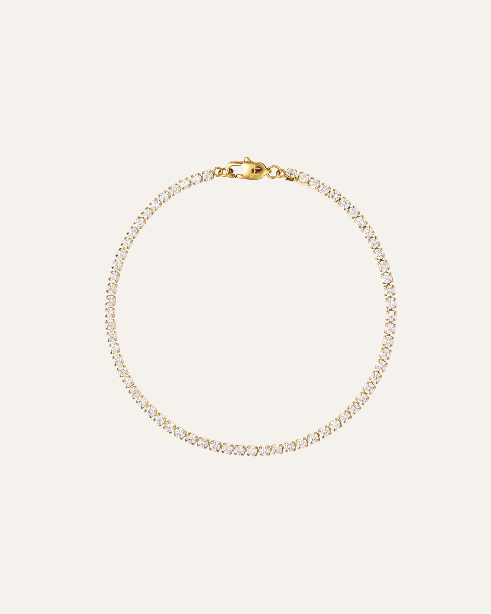 Shiny Tennis Bracelet is a bracelet designed with sparkling cubic zirconia stones running along the entire chain. Made from stainless steel with 18K gold PVD plating, it is both durable and water-resistant, ensuring it retains its color and shine over time.