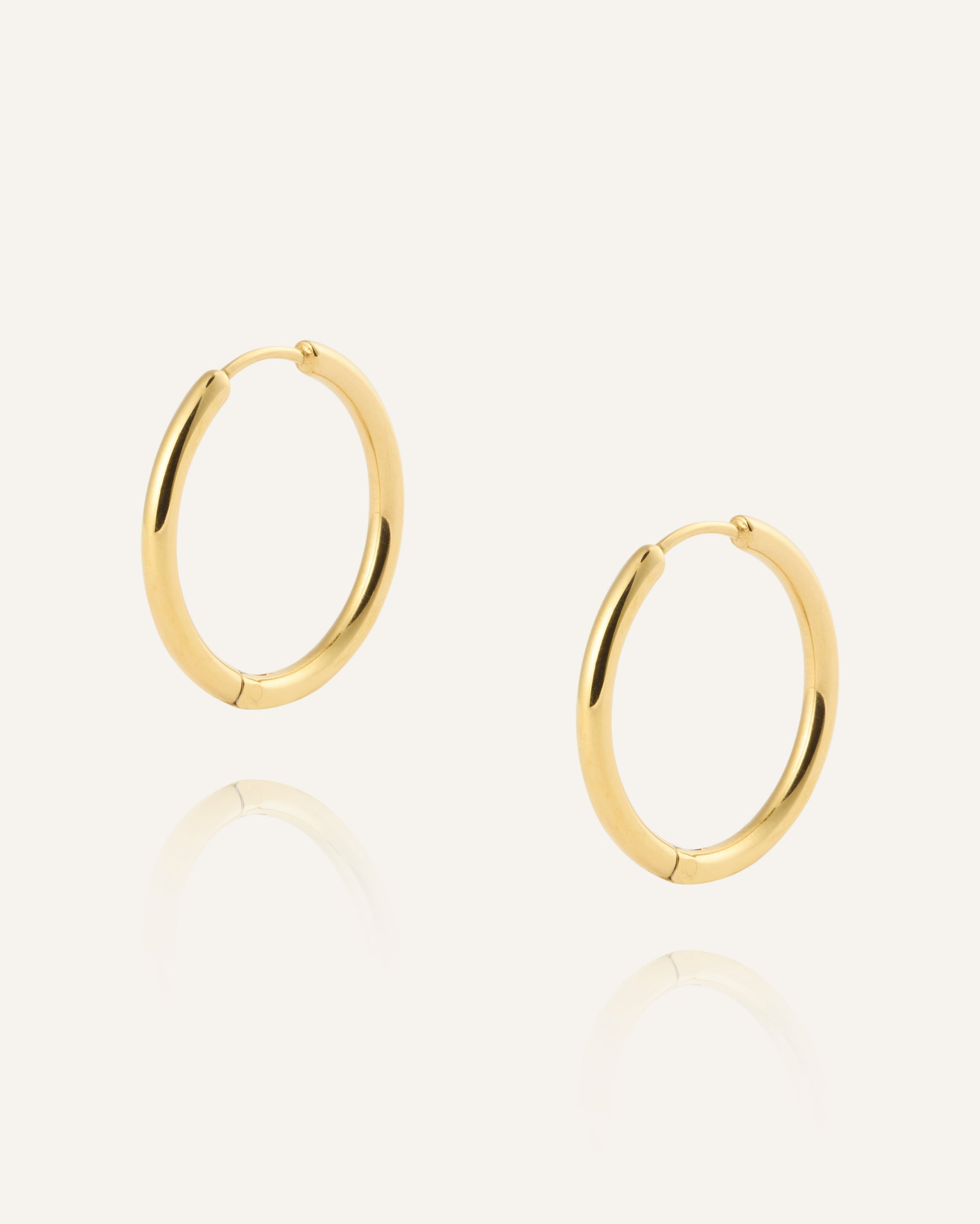 Slim Gold Hoops feature a thin, softly rounded shape that shimmers with a warm gold tone. The timeless design offers a clean look and is easy to wear and style from day to night. Wear them solo for a pared-back style or pair with other earrings for a personal touch.