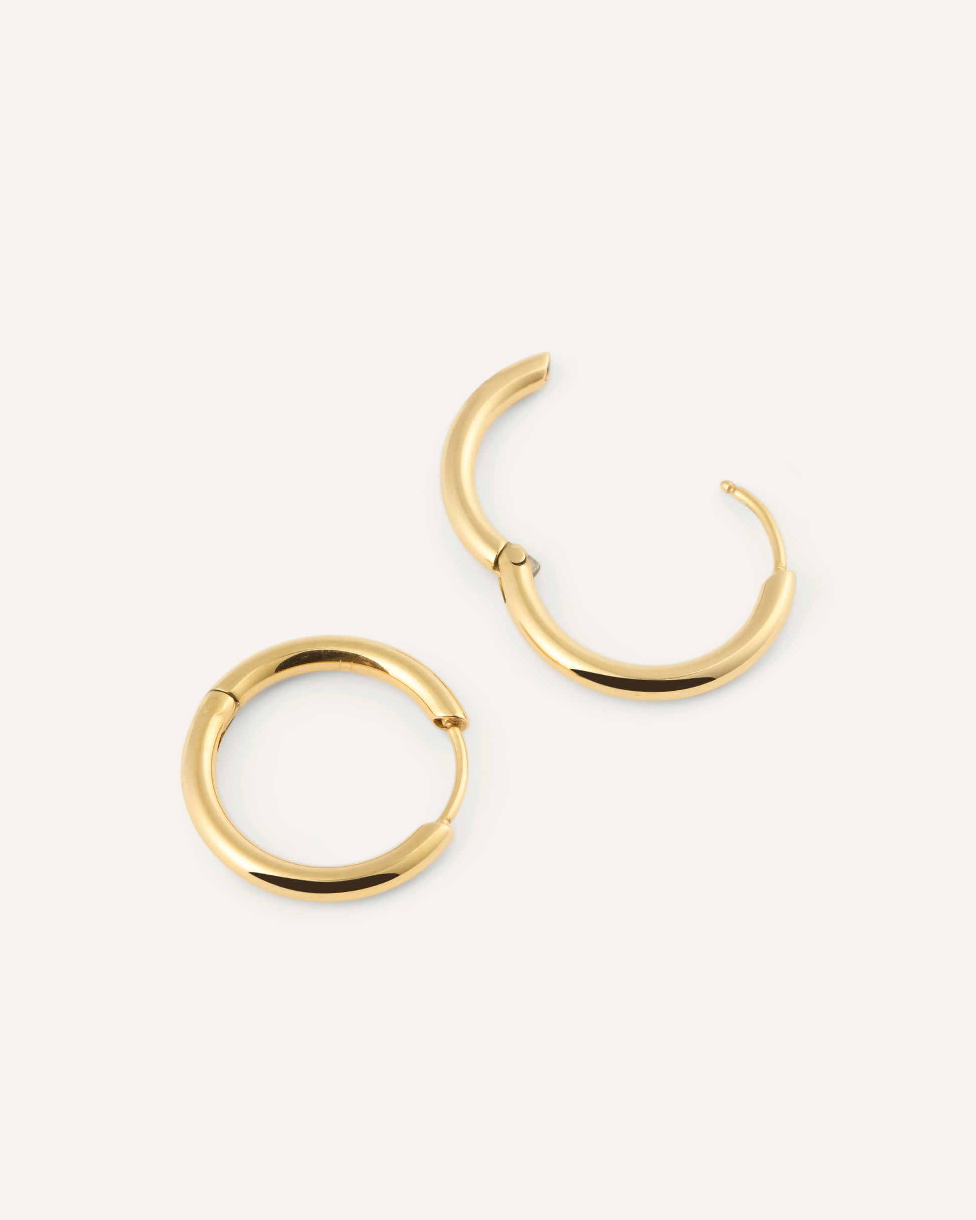 Slim Gold Hoops feature a thin, softly rounded shape that shimmers with a warm gold tone. The timeless design offers a clean look and is easy to wear and style from day to night. Wear them solo for a pared-back style or pair with other earrings for a personal touch.