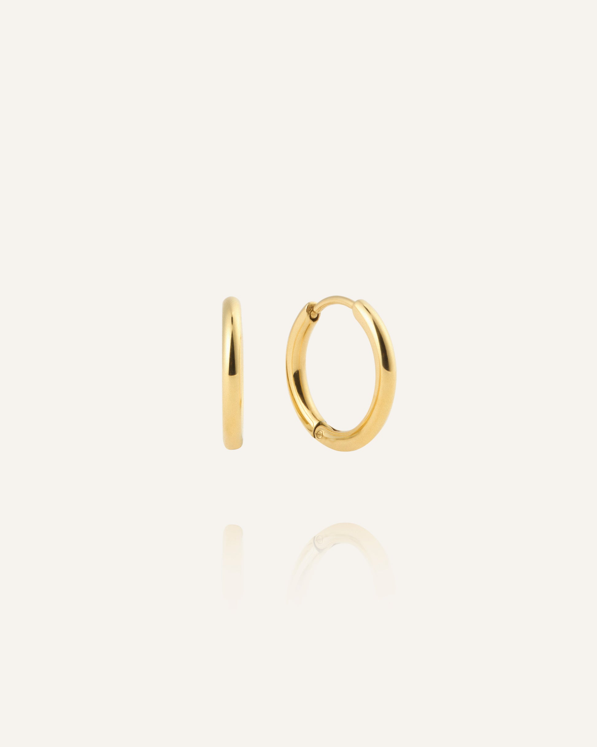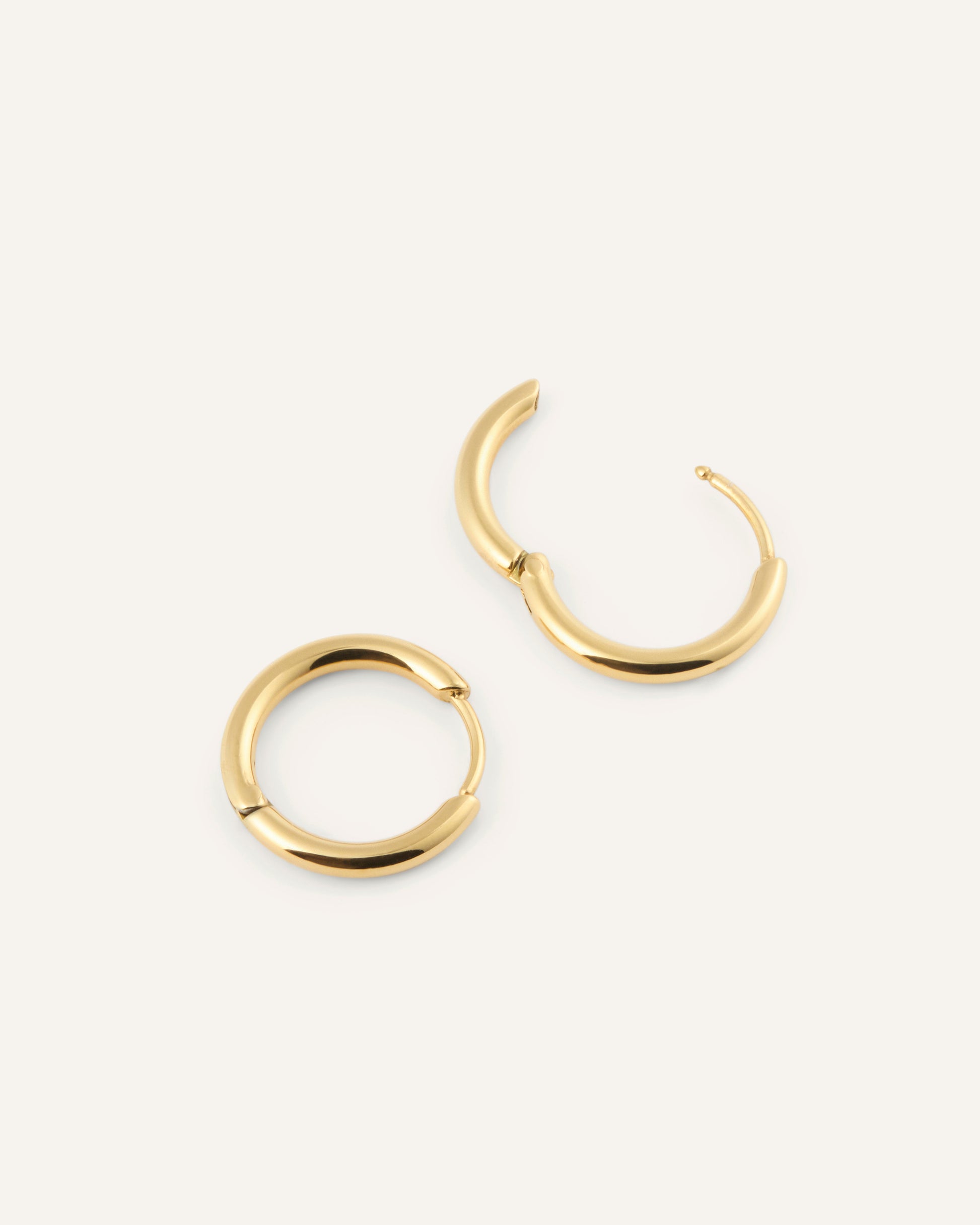 Slim Gold Hoops feature a thin, softly rounded shape that shimmers with a warm gold tone. The timeless design offers a clean look and is easy to wear and style from day to night. Wear them solo for a pared-back style or pair with other earrings for a personal touch.