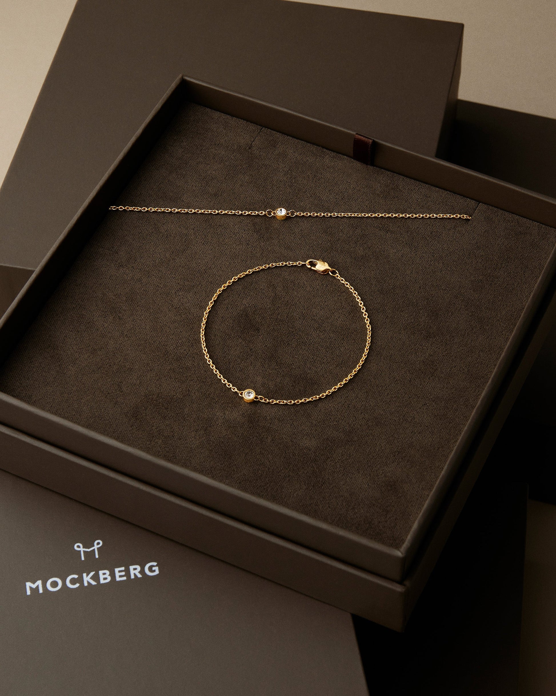 Clear stone, fine chain — two pieces that always feel right. Thin Diamond in gold-tone adds a quiet shimmer close to the skin — wear as a set for a harmonious line or separately when you want to keep it simple. Durable steel with 18K gold PVD coating that retains its shine over time.