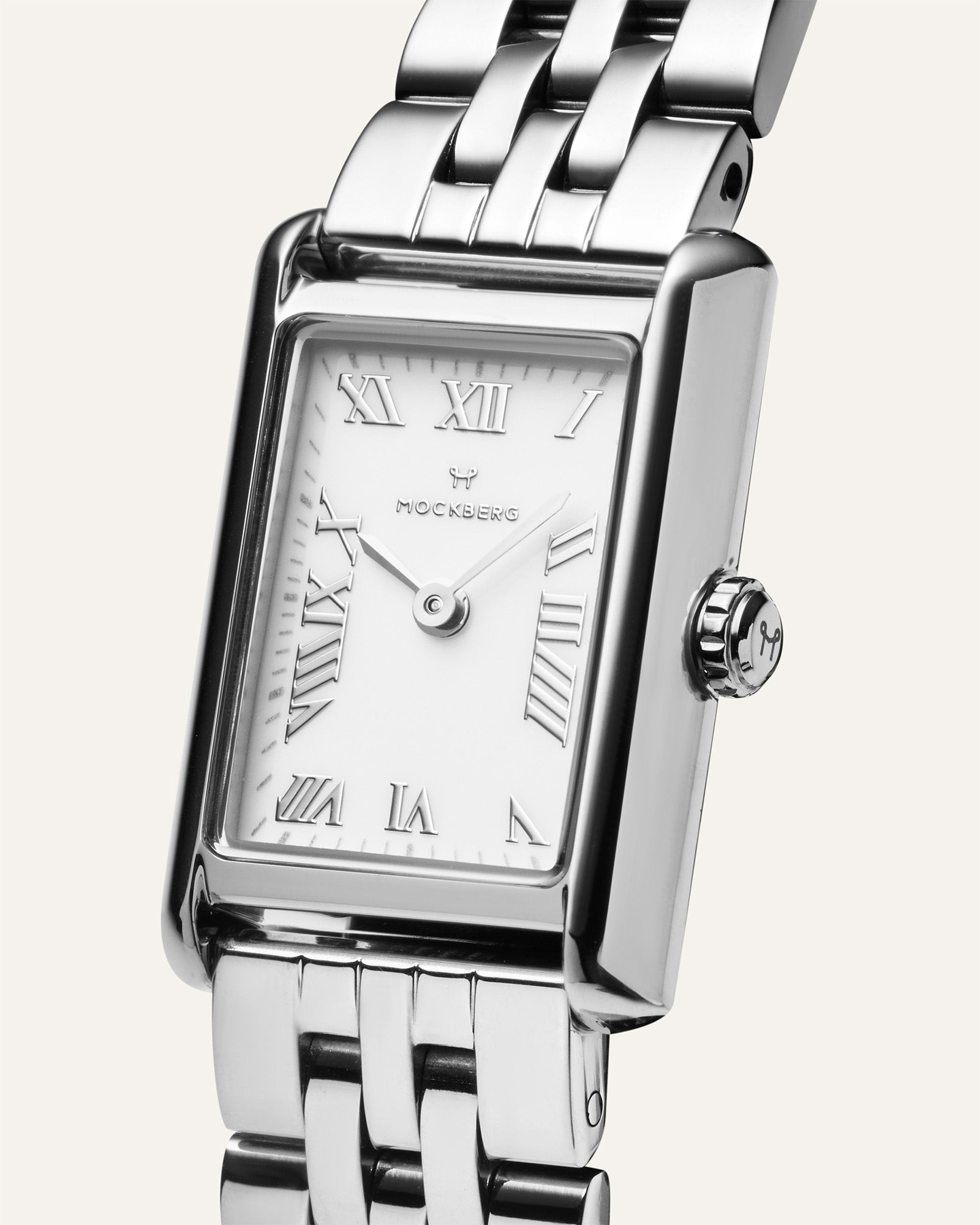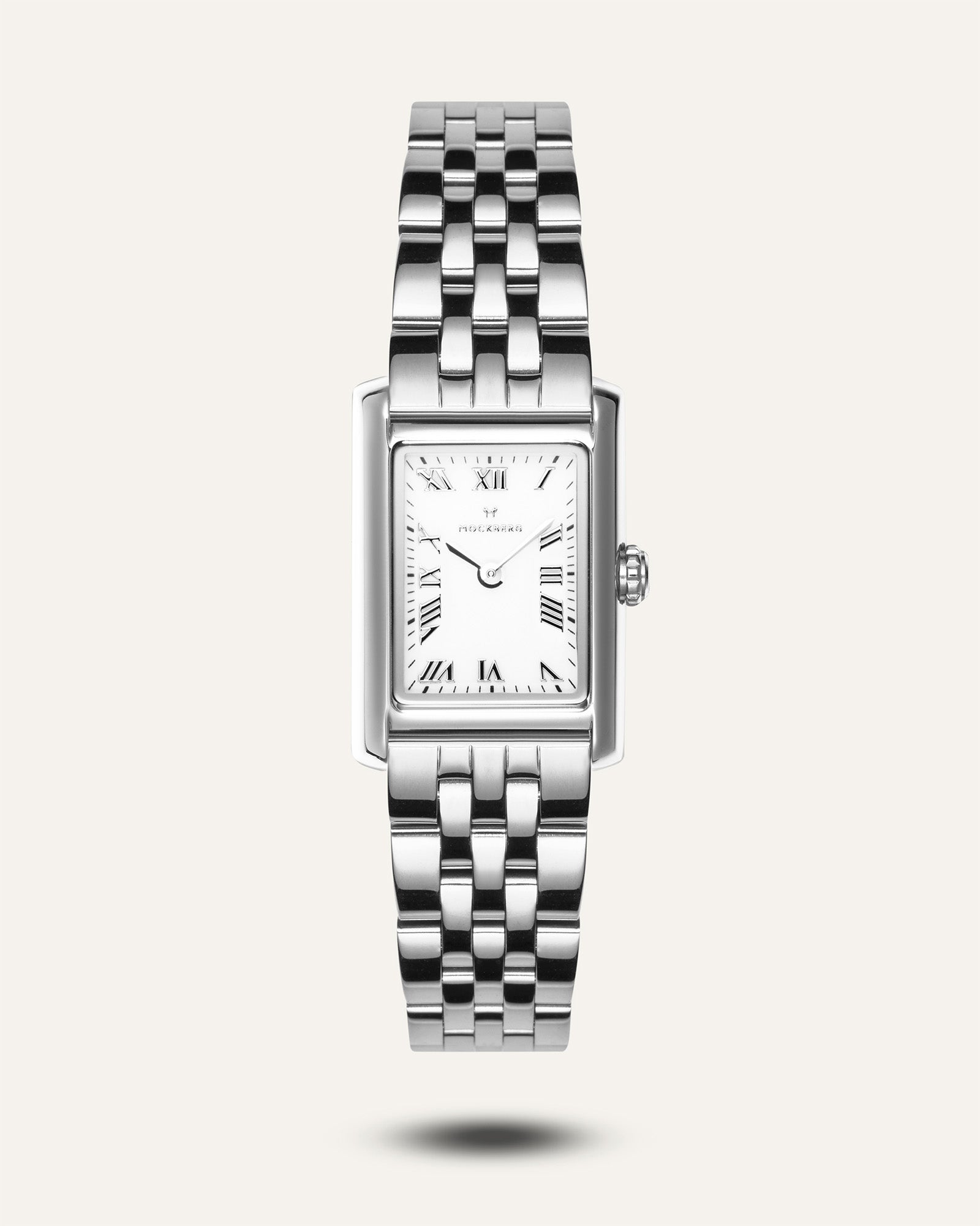 Our bestseller with a timeless and elegant design. The rectangular case in solid stainless steel measures 19 x 28 mm and frames an elegant dial with Roman numerals. Equipped with a Japanese movement and a classic link bracelet, it’s a timeless accessory for any occasion.