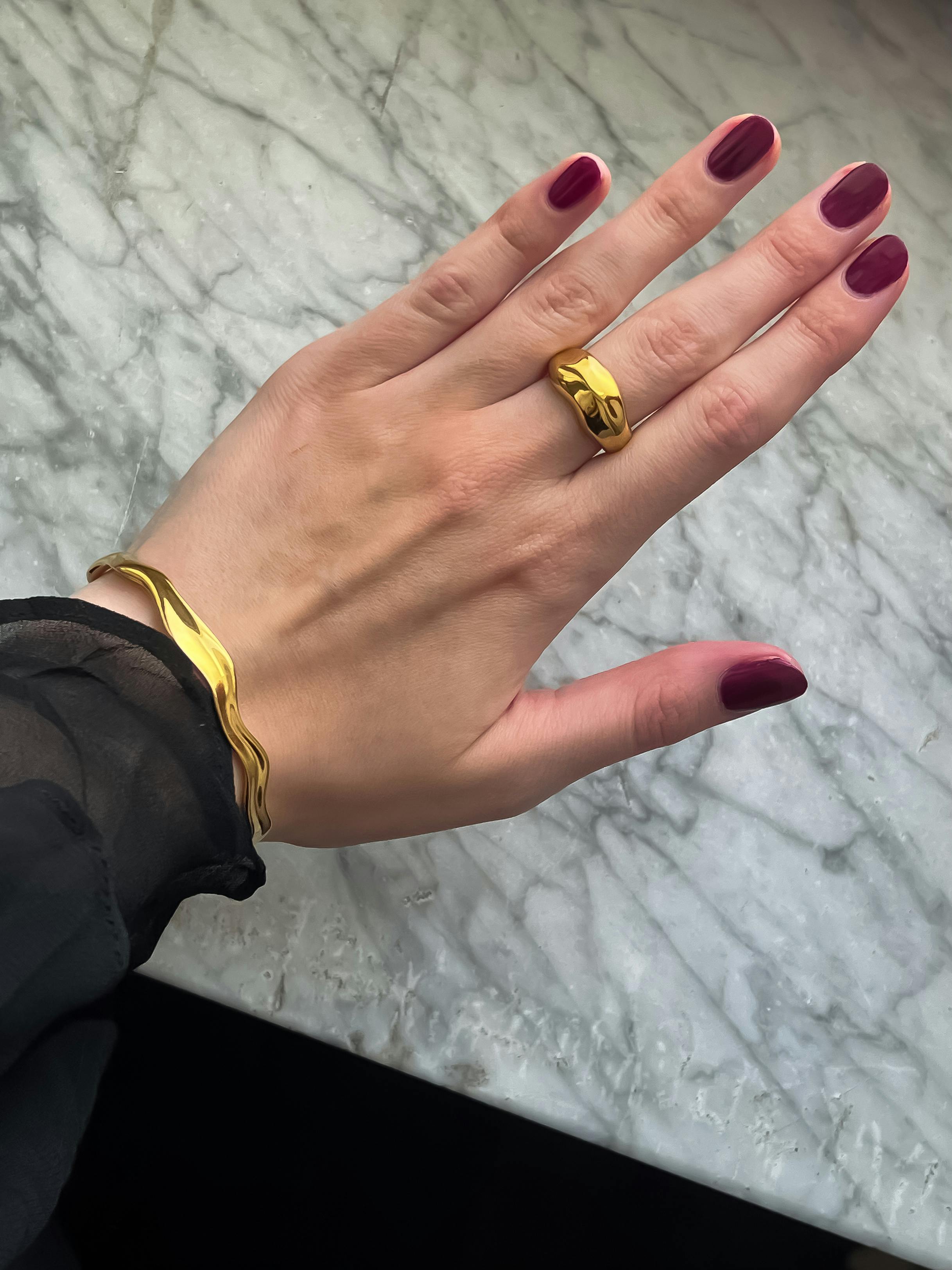 Wavy Bolded Large Ring is the larger statement ring with a soft wave design from the Wavy Collection. Made from solid stainless steel with 18K gold PVD plating, it is water-resistant and durable. Wear it every day – swim, shower, and work out without worrying about it losing its color.